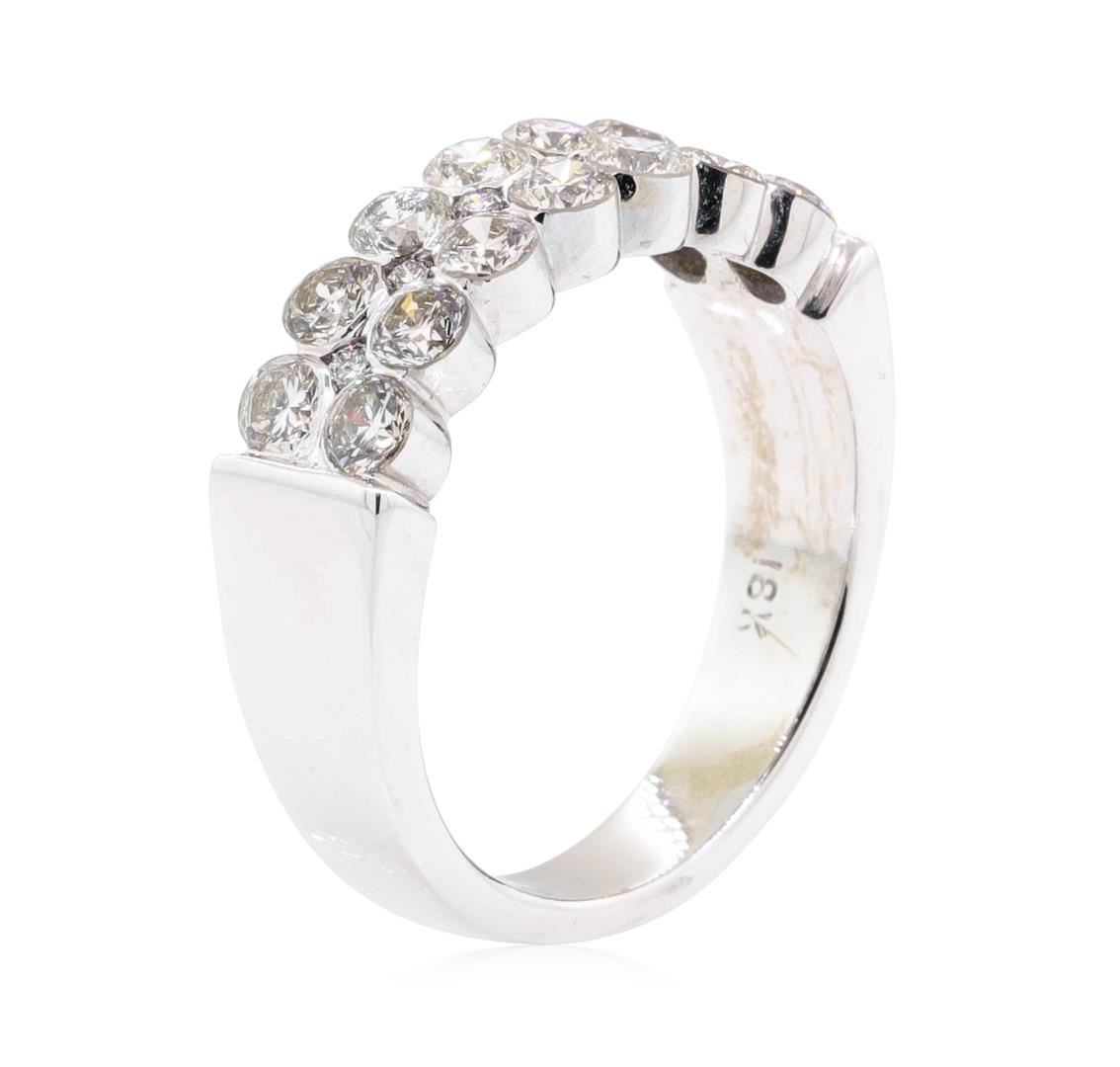 One electronically tested 18KT white gold Ladies cast fashion wedding band with a double row raised shoulders motif with a bright polish finish. The featured Ladies ring has a shank measuring 4.00 millimeters in width. Identified with markings of '18K'. Condition is new, good workmanship. Containing: Fourteen channel set round brilliant cut diamonds, measuring 3.00 - 2.90 x 1.83mm (depth est.) approximate total weight of 14 Stones = 1.40ct. Graded in the setting. Color H - I Clarity VS-2 to SI-1 Cut Good Six prong set round brilliant cut diamonds, measuring 1.80 - 1.70 x 1.07mm (depth est.) approximate total weight of 6 Stones = 0.12ct. Graded in the setting. Color H - I Clarity VS-2 to SI-1 Cut Very Good. Total Weight of Diamonds 1.52ct.. Total Weight of Wedding Band 7.60gm. GAS Appraised.