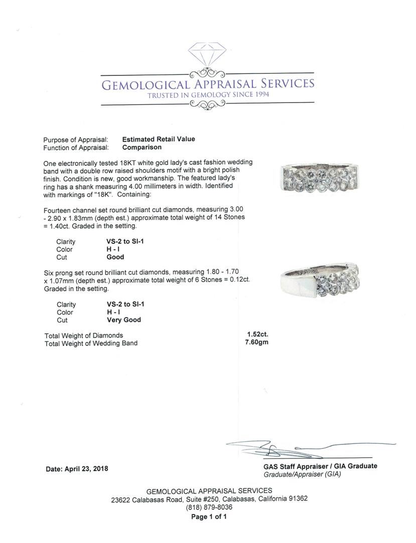 One electronically tested 18KT white gold Ladies cast fashion wedding band with a double row raised shoulders motif with a bright polish finish. The featured Ladies ring has a shank measuring 4.00 millimeters in width. Identified with markings of '18K'. Condition is new, good workmanship. Containing: Fourteen channel set round brilliant cut diamonds, measuring 3.00 - 2.90 x 1.83mm (depth est.) approximate total weight of 14 Stones = 1.40ct. Graded in the setting. Color H - I Clarity VS-2 to SI-1 Cut Good Six prong set round brilliant cut diamonds, measuring 1.80 - 1.70 x 1.07mm (depth est.) approximate total weight of 6 Stones = 0.12ct. Graded in the setting. Color H - I Clarity VS-2 to SI-1 Cut Very Good. Total Weight of Diamonds 1.52ct.. Total Weight of Wedding Band 7.60gm. GAS Appraised.