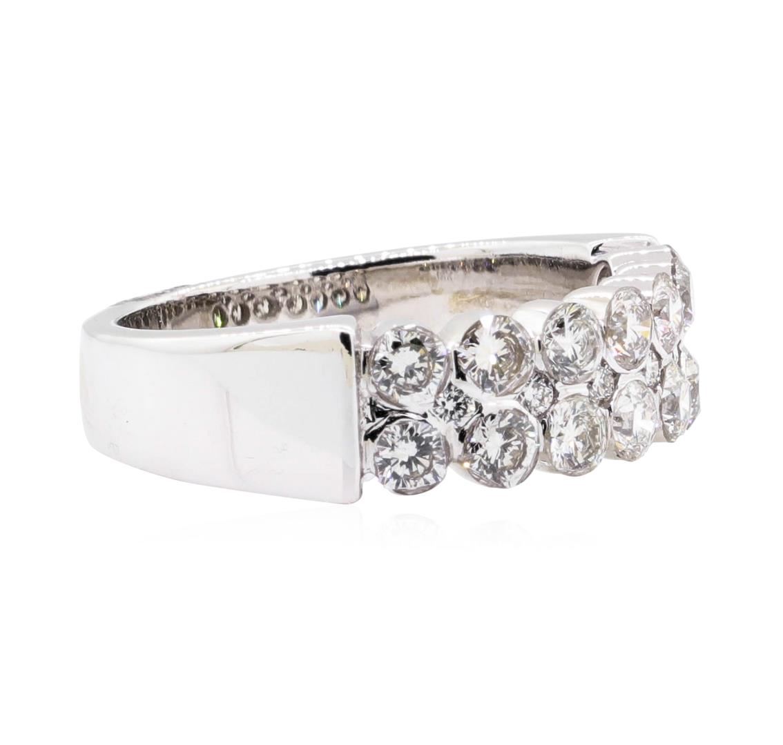 One electronically tested 18KT white gold Ladies cast fashion wedding band with a double row raised shoulders motif with a bright polish finish. The featured Ladies ring has a shank measuring 4.00 millimeters in width. Identified with markings of '18K'. Condition is new, good workmanship. Containing: Fourteen channel set round brilliant cut diamonds, measuring 3.00 - 2.90 x 1.83mm (depth est.) approximate total weight of 14 Stones = 1.40ct. Graded in the setting. Color H - I Clarity VS-2 to SI-1 Cut Good Six prong set round brilliant cut diamonds, measuring 1.80 - 1.70 x 1.07mm (depth est.) approximate total weight of 6 Stones = 0.12ct. Graded in the setting. Color H - I Clarity VS-2 to SI-1 Cut Very Good. Total Weight of Diamonds 1.52ct.. Total Weight of Wedding Band 7.60gm. GAS Appraised.
