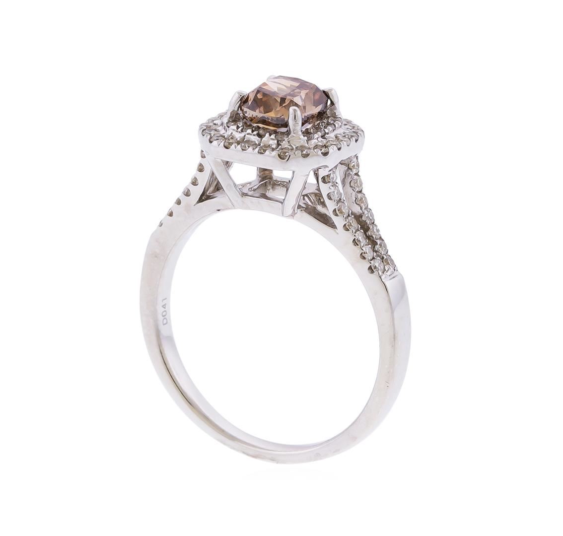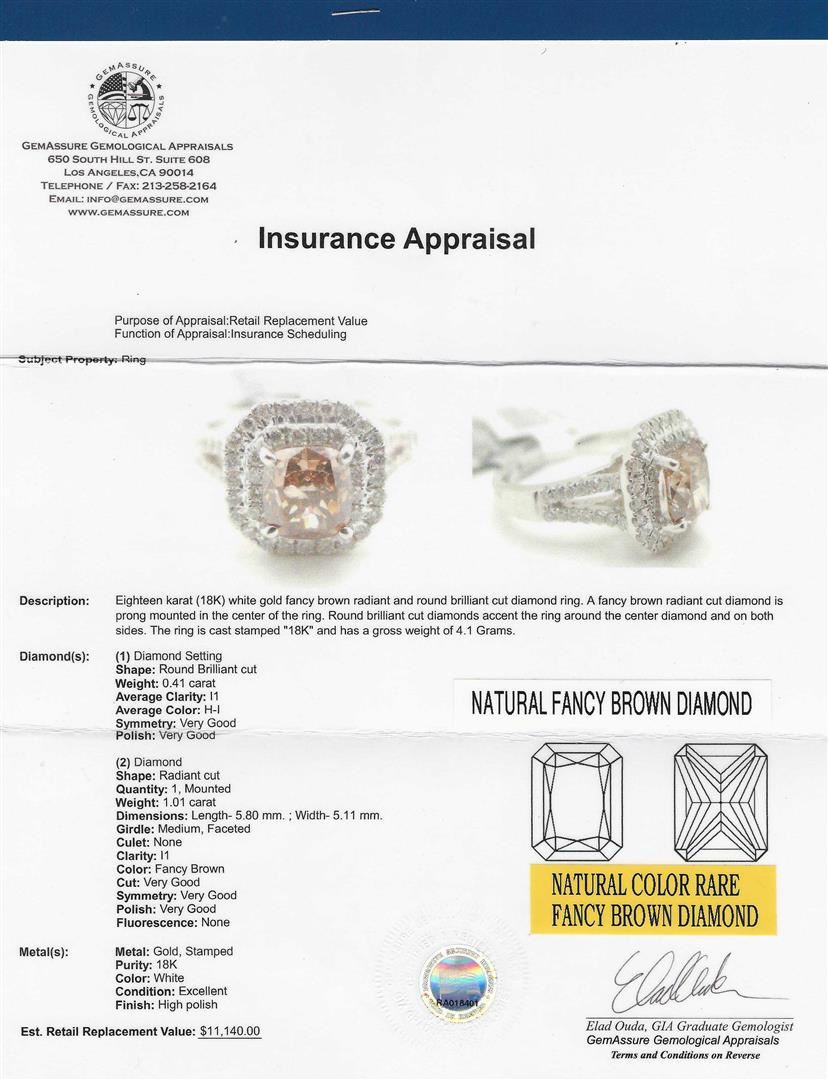 One eighteen karat (18K) white gold fancy brown radiant and round brilliant cut diamond ring. A fancy brown radiant cut diamond, clarity I1, weighing 1.01 carat, is prong mounted in the center of the ring. Round brilliant cut diamonds accent the ring around the center diamond and on both sides with an average clarity of I1, average color of H-I. The ring is cast stamped "18K" and has a gross weight of 4.1 Grams. GGA Appraised at $11,140.00.