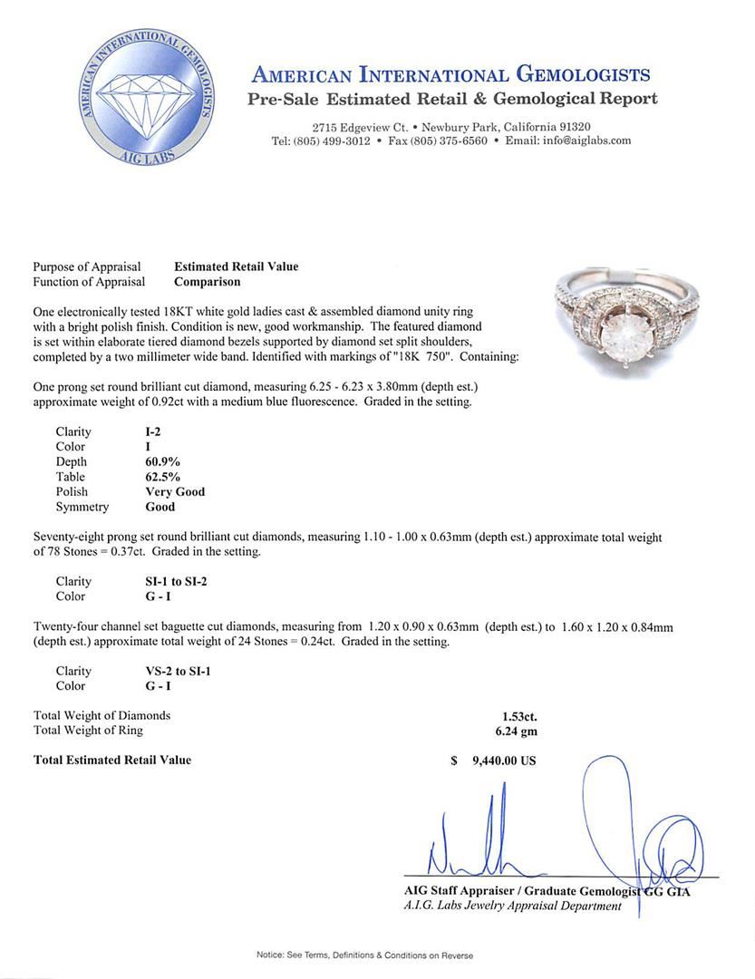 One electronically tested 18KT white gold ladies cast & assembled diamond unity ring with a bright polish finish. The featured diamond is set within elaborate tiered diamond bezels supported by diamond set split shoulders, completed by a two millimeter wide band. Identified with markings of "18K 750". Condition is new, good workmanship. Containing: One prong set round brilliant cut diamond, measuring 6.25 - 6.23 x 3.80mm (depth est.) approximate weight of 0.92ct with a medium blue fluorescence. Graded in the setting. Clarity: I-2. Color: IDepth 60.9%. Table 62.5%. Seventy-Eight prong set round brilliant cut diamonds, measuring 1.10 - 1.00 x 0.63mm (depth est.) approximate total weight of 78 Stones = 0.37ct. Graded in the setting. Clarity: SI-1 to SI-2. Color: G - I Twenty-Four channel set baguette cut diamonds, measuring from 1.20 x 0.90 x 0.63mm (depth est.) to 1.60 x 1.20 x 0.84mm (depth est.) approximate total weight of 24 Stones = 0.24ct. Graded in the setting. Clarity: VS-2 to SI-1. Color: G - I. Total Weight of Diamonds 1.53ct. Total Weight of Ring 6.24gm. AIG Appraised at $9,440.00.