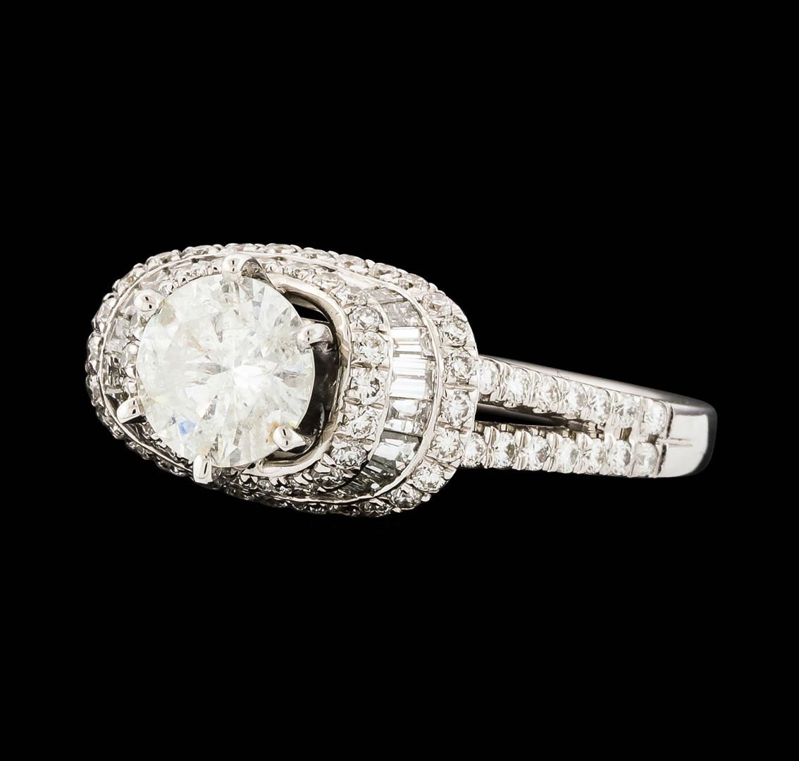 One electronically tested 18KT white gold ladies cast & assembled diamond unity ring with a bright polish finish. The featured diamond is set within elaborate tiered diamond bezels supported by diamond set split shoulders, completed by a two millimeter wide band. Identified with markings of "18K 750". Condition is new, good workmanship. Containing: One prong set round brilliant cut diamond, measuring 6.25 - 6.23 x 3.80mm (depth est.) approximate weight of 0.92ct with a medium blue fluorescence. Graded in the setting. Clarity: I-2. Color: IDepth 60.9%. Table 62.5%. Seventy-Eight prong set round brilliant cut diamonds, measuring 1.10 - 1.00 x 0.63mm (depth est.) approximate total weight of 78 Stones = 0.37ct. Graded in the setting. Clarity: SI-1 to SI-2. Color: G - I Twenty-Four channel set baguette cut diamonds, measuring from 1.20 x 0.90 x 0.63mm (depth est.) to 1.60 x 1.20 x 0.84mm (depth est.) approximate total weight of 24 Stones = 0.24ct. Graded in the setting. Clarity: VS-2 to SI-1. Color: G - I. Total Weight of Diamonds 1.53ct. Total Weight of Ring 6.24gm. AIG Appraised.