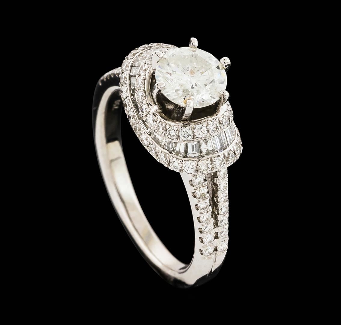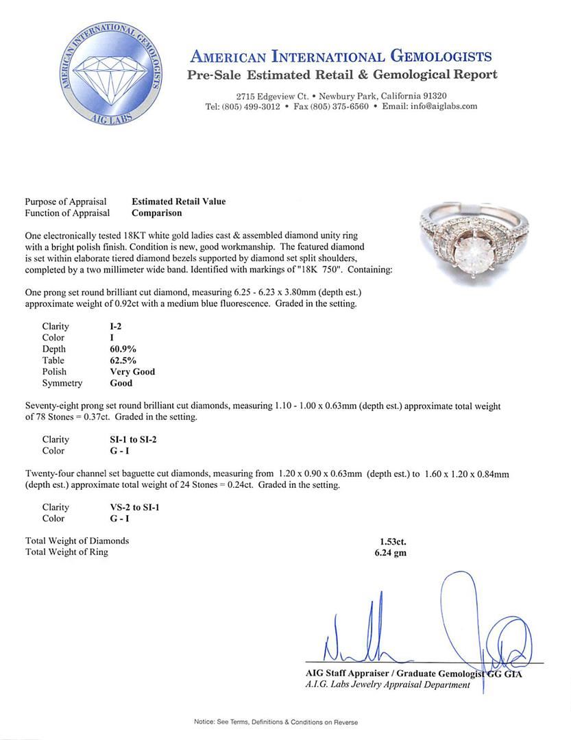 One electronically tested 18KT white gold ladies cast & assembled diamond unity ring with a bright polish finish. The featured diamond is set within elaborate tiered diamond bezels supported by diamond set split shoulders, completed by a two millimeter wide band. Identified with markings of "18K 750". Condition is new, good workmanship. Containing: One prong set round brilliant cut diamond, measuring 6.25 - 6.23 x 3.80mm (depth est.) approximate weight of 0.92ct with a medium blue fluorescence. Graded in the setting. Clarity: I-2. Color: IDepth 60.9%. Table 62.5%. Seventy-Eight prong set round brilliant cut diamonds, measuring 1.10 - 1.00 x 0.63mm (depth est.) approximate total weight of 78 Stones = 0.37ct. Graded in the setting. Clarity: SI-1 to SI-2. Color: G - I Twenty-Four channel set baguette cut diamonds, measuring from 1.20 x 0.90 x 0.63mm (depth est.) to 1.60 x 1.20 x 0.84mm (depth est.) approximate total weight of 24 Stones = 0.24ct. Graded in the setting. Clarity: VS-2 to SI-1. Color: G - I. Total Weight of Diamonds 1.53ct. Total Weight of Ring 6.24gm. AIG Appraised.