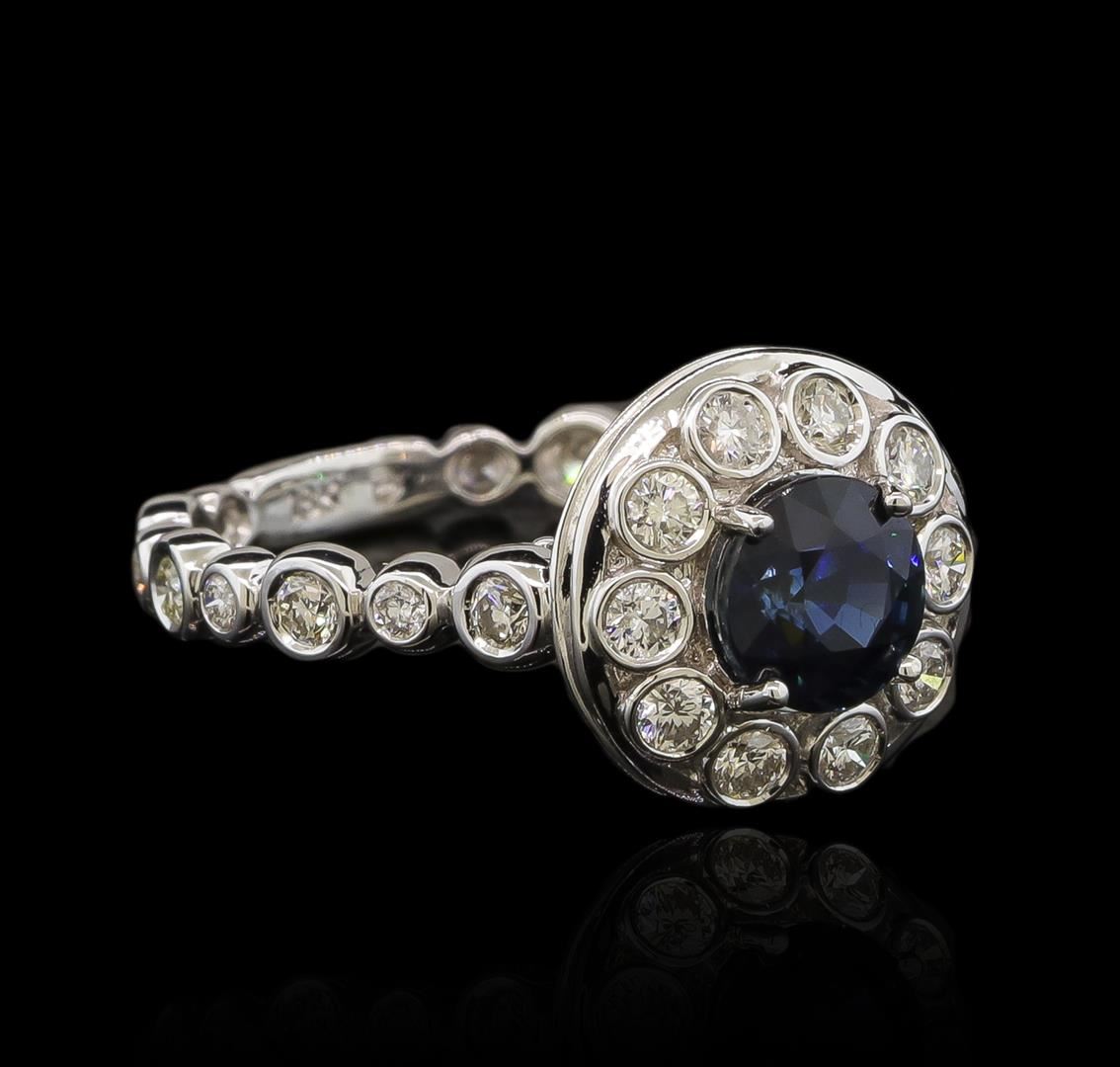 One electronically tested 18KT white gold lady's cast fashion ring with a cathedral halo with a bright polish with milgrain detailing finish. The featured lady's ring has a shank measuring 2.40 millimeters wide. Identified with markings of "18K". Condition is new, good workmanship. Containing: One prong set round modified mixed cut natural blue sapphire, measuring 6.50 - 6.44 x 4.70 mm, (depth est.) approximate weight of 1.57ct., clarity is eye clean, dark, strong, blue color, (GIA B 7/5), cut is very good. Transmitting light with no distortion, transparent. Colored gemstones are presumed to have been subjected to commonly used enhancement processes. Graded in the setting.Eighteen bezel set round brilliant cut diamonds, measuring 2.25 - 2.15 x 1.36mm (depth est.) approximate total weight of 18 Stones = 0.74ct. Graded in the setting. Clarity: VS-2 to SI-2. Color: H - ICut Very Good Eight bezel set round brilliant cut diamonds, measuring 1.60 - 1.50 x 0.95mm (depth est.) approximate total weight of 8 Stones = 0.11ct. Graded in the setting. Clarity: VS-2 to SI-2. Color: H - ICut Good. Total Weight of Colored Stones 1.57ct. Total Weight of Diamonds 0.85ct. Total Weight of Ring 5.20gm. GAS Appraised.