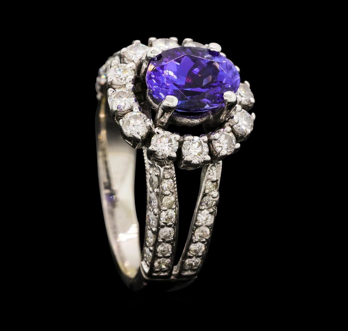 One electronically tested 18KT white gold lady's cast fashion ring with a split shank basket halo with a bright polish with milgrain detailing finish. The featured lady's ring has a shank measuring 2.81 millimeters wide. Identified with markings of "18K 750". Condition is like new, good workmanship. Containing: One prong set oval modified brilliant cut natural tanzanite, measuring 7.98 x 6.02 x 4.79mm, (depth est.) approximate weight of 1.59ct., clarity is eye clean, dark, moderately strong, violetish blue color, (GIA vB 7/4), cut is very good. Transmitting light with no distortion, transparent. Colored gemstones are presumed to have been subjected to commonly used enhancement processes. Graded in the setting. Twelve prong set round brilliant cut diamonds, measuring 2.30 - 2.20 x 1.40mm (depth est.) approximate. Total Weight of 12 Stones = 0.52ct. Graded in the setting. Color H - I Clarity SI-1 to SI-2 Cut Good Thirty-Six prong set round brilliant cut diamonds, measuring 1.50 - 1.40 x 0.90mm (depth est.) approximate. Total Weight of 36 Stones = 0.42ct. Graded in the setting. Color H - I Clarity SI-2 to I-1 Cut Good Eight prong set round brilliant cut diamonds, measuring 1.00 - 0.90 x 0.59mm (depth est.) approximate. Total Weight of 8 Stones = 0.03ct. Graded in the setting. Color H - I Clarity SI-2 to I-1 Cut Good. Total Weight of Colored Stones 1.59ct.. Total Weight of Diamonds 0.97ct.. Total Weight of Ring 5.30gm. GAS Appraised.