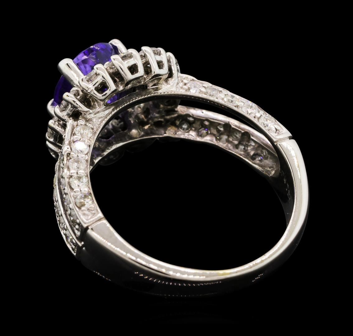 One electronically tested 18KT white gold lady's cast fashion ring with a split shank basket halo with a bright polish with milgrain detailing finish. The featured lady's ring has a shank measuring 2.81 millimeters wide. Identified with markings of "18K 750". Condition is like new, good workmanship. Containing: One prong set oval modified brilliant cut natural tanzanite, measuring 7.98 x 6.02 x 4.79mm, (depth est.) approximate weight of 1.59ct., clarity is eye clean, dark, moderately strong, violetish blue color, (GIA vB 7/4), cut is very good. Transmitting light with no distortion, transparent. Colored gemstones are presumed to have been subjected to commonly used enhancement processes. Graded in the setting. Twelve prong set round brilliant cut diamonds, measuring 2.30 - 2.20 x 1.40mm (depth est.) approximate. Total Weight of 12 Stones = 0.52ct. Graded in the setting. Color H - I Clarity SI-1 to SI-2 Cut Good Thirty-Six prong set round brilliant cut diamonds, measuring 1.50 - 1.40 x 0.90mm (depth est.) approximate. Total Weight of 36 Stones = 0.42ct. Graded in the setting. Color H - I Clarity SI-2 to I-1 Cut Good Eight prong set round brilliant cut diamonds, measuring 1.00 - 0.90 x 0.59mm (depth est.) approximate. Total Weight of 8 Stones = 0.03ct. Graded in the setting. Color H - I Clarity SI-2 to I-1 Cut Good. Total Weight of Colored Stones 1.59ct.. Total Weight of Diamonds 0.97ct.. Total Weight of Ring 5.30gm. GAS Appraised.