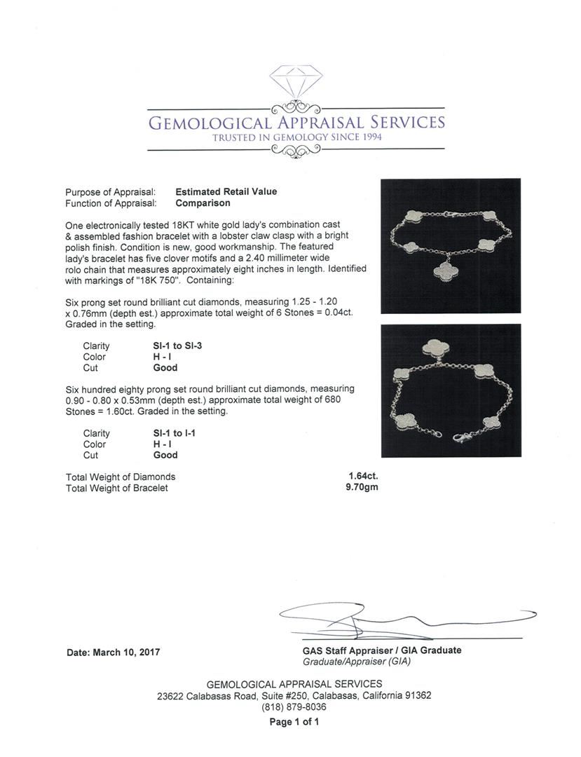 One electronically tested 18KT white gold lady's combination cast & assembled fashion bracelet with a lobster claw clasp with a bright polish finish. The featured lady's bracelet has five clover motifs and a 2.40 millimeter wide rolo chain that measures approximately eight inches in length. Identified with markings of "18K 750". Condition is new, good workmanship. Containing: Six prong set round brilliant cut diamonds, measuring 1.25 - 1.20 x 0.76mm (depth est.) approximate total weight of 6 Stones = 0.04ct. Graded in the setting. Color H - I Clarity SI-1 to SI-3 Cut Good Six Hundred Eighty prong set round brilliant cut diamonds, measuring 0.90 - 0.80 x 0.53mm (depth est.) approximate total weight of 680 Stones = 1.60ct. Graded in the setting. Color H - I Clarity SI-1 to I-1 Cut Good. Total Weight of Diamonds 1.64ct. Total Weight of Bracelet 9.70gm. GAS Appraised.