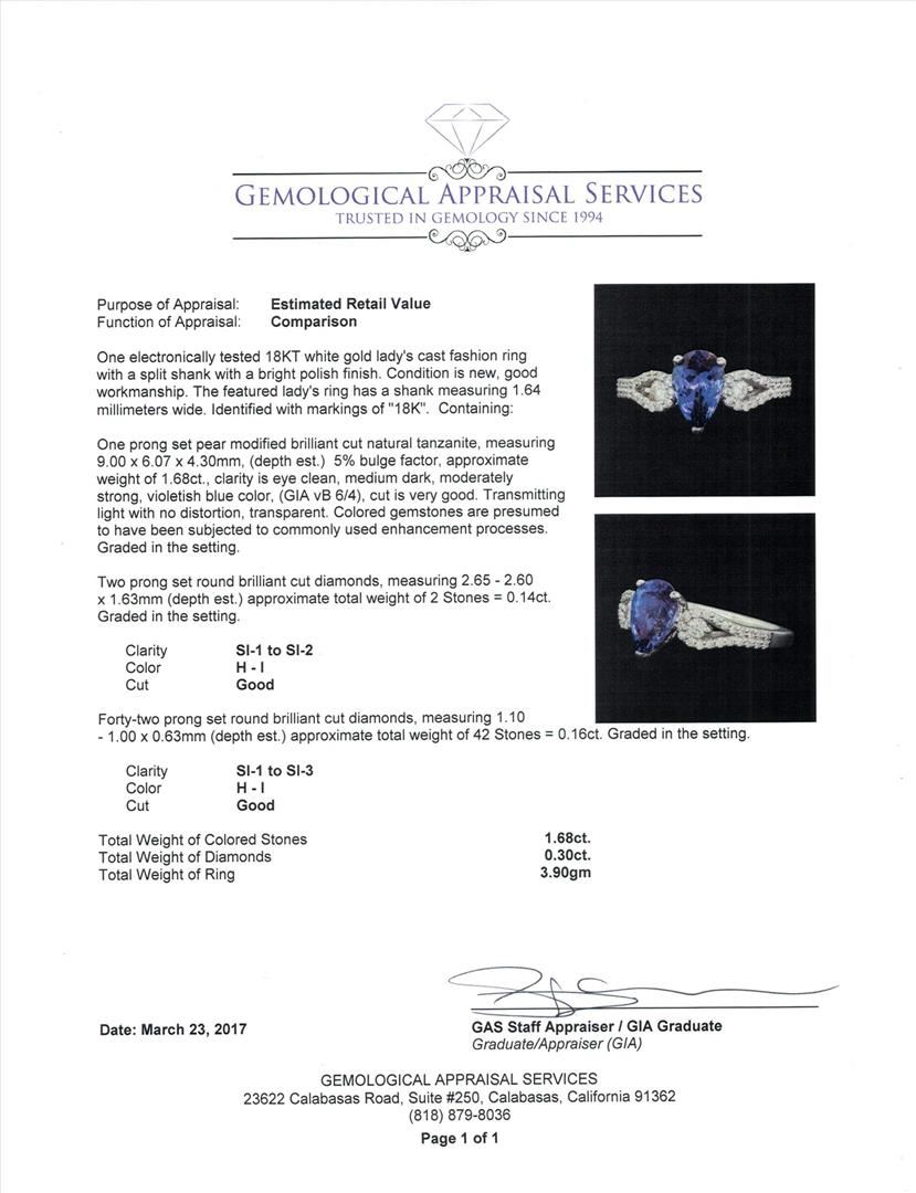 One electronically tested 18KT white gold lady's cast fashion ring with a split shank with a bright polish finish. The featured lady's ring has a shank measuring 1.64 millimeters wide. Identified with markings of "18K". Condition is new, good workmanship. Containing: One prong set pear modified brilliant cut natural tanzanite, measuring 9.00 x 6.07 x 4.30mm, (depth est.) 5%. bulge factor, approximate weight of 1.68ct., clarity is eye clean, medium dark, moderately strong, violetish blue color, (GIA vB 6/4), cut is very good. Transmitting light with no distortion, transparent. Colored gemstones are presumed to have been subjected to commonly used enhancement processes. Graded in the setting. Two prong set round brilliant cut diamonds, measuring 2.65 - 2.60 x 1.63mm (depth est.) approximate. Total Weight of 2 Stones = 0.14ct. Graded in the setting. Color H - I Clarity SI-1 to SI-2 Cut Good Forty-Two prong set round brilliant cut diamonds, measuring 1.10 - 1.00 x 0.63mm (depth est.) approximate. Total Weight of 42 Stones = 0.16ct. Graded in the setting. Color H - I Clarity SI-1 to SI-3 Cut Good. Total Weight of Colored Stones 1.68ct.. Total Weight of Diamonds 0.30ct.. Total Weight of Ring 3.90gm. GAS Appraised.