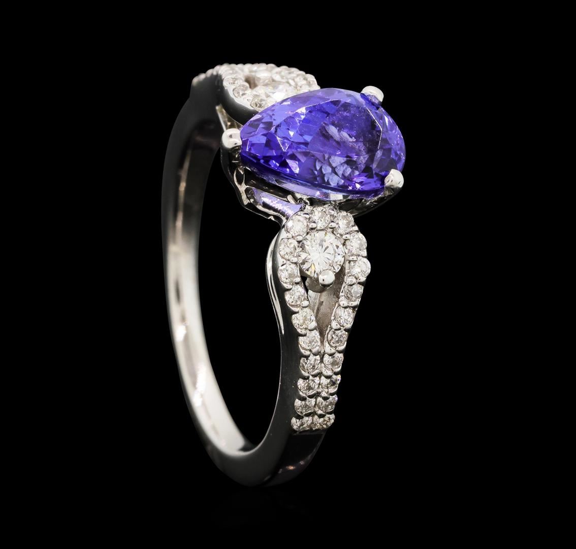 One electronically tested 18KT white gold lady's cast fashion ring with a split shank with a bright polish finish. The featured lady's ring has a shank measuring 1.64 millimeters wide. Identified with markings of "18K". Condition is new, good workmanship. Containing: One prong set pear modified brilliant cut natural tanzanite, measuring 9.00 x 6.07 x 4.30mm, (depth est.) 5%. bulge factor, approximate weight of 1.68ct., clarity is eye clean, medium dark, moderately strong, violetish blue color, (GIA vB 6/4), cut is very good. Transmitting light with no distortion, transparent. Colored gemstones are presumed to have been subjected to commonly used enhancement processes. Graded in the setting. Two prong set round brilliant cut diamonds, measuring 2.65 - 2.60 x 1.63mm (depth est.) approximate. Total Weight of 2 Stones = 0.14ct. Graded in the setting. Color H - I Clarity SI-1 to SI-2 Cut Good Forty-Two prong set round brilliant cut diamonds, measuring 1.10 - 1.00 x 0.63mm (depth est.) approximate. Total Weight of 42 Stones = 0.16ct. Graded in the setting. Color H - I Clarity SI-1 to SI-3 Cut Good. Total Weight of Colored Stones 1.68ct.. Total Weight of Diamonds 0.30ct.. Total Weight of Ring 3.90gm. GAS Appraised.
