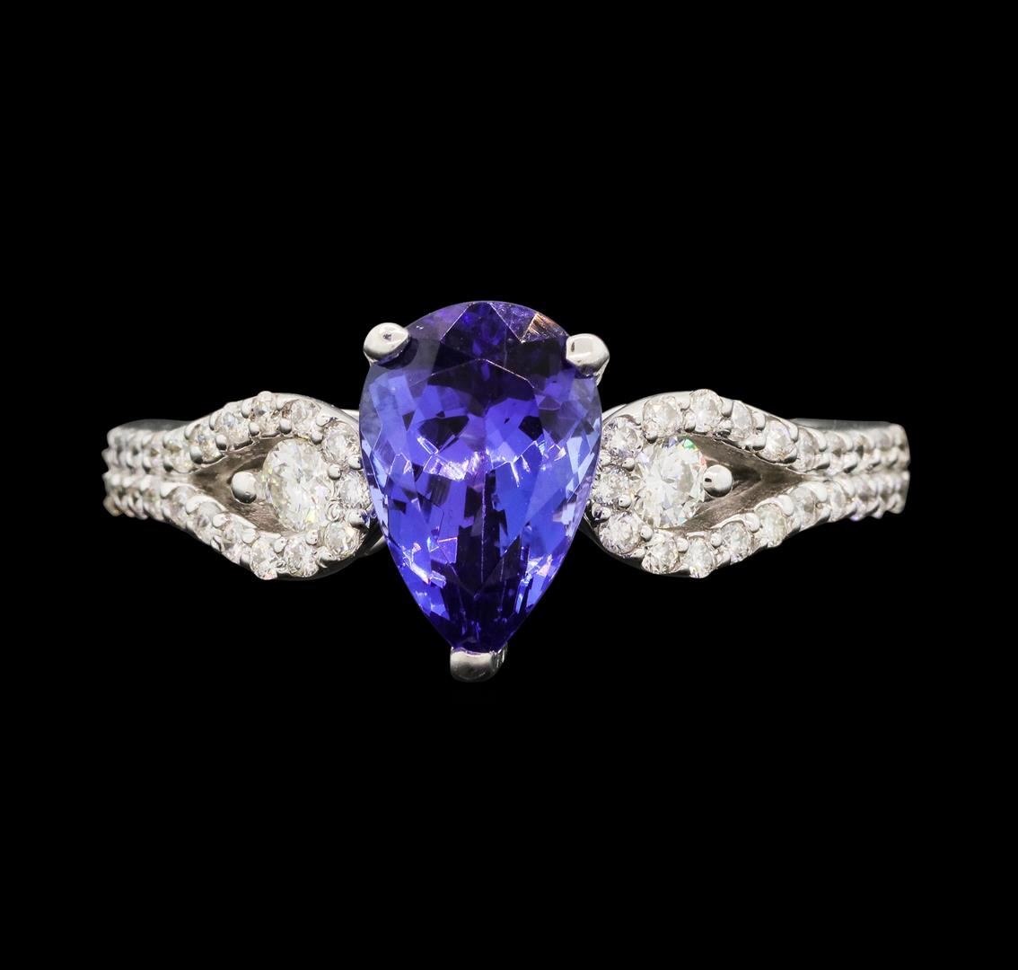 One electronically tested 18KT white gold lady's cast fashion ring with a split shank with a bright polish finish. The featured lady's ring has a shank measuring 1.64 millimeters wide. Identified with markings of "18K". Condition is new, good workmanship. Containing: One prong set pear modified brilliant cut natural tanzanite, measuring 9.00 x 6.07 x 4.30mm, (depth est.) 5%. bulge factor, approximate weight of 1.68ct., clarity is eye clean, medium dark, moderately strong, violetish blue color, (GIA vB 6/4), cut is very good. Transmitting light with no distortion, transparent. Colored gemstones are presumed to have been subjected to commonly used enhancement processes. Graded in the setting. Two prong set round brilliant cut diamonds, measuring 2.65 - 2.60 x 1.63mm (depth est.) approximate. Total Weight of 2 Stones = 0.14ct. Graded in the setting. Color H - I Clarity SI-1 to SI-2 Cut Good Forty-Two prong set round brilliant cut diamonds, measuring 1.10 - 1.00 x 0.63mm (depth est.) approximate. Total Weight of 42 Stones = 0.16ct. Graded in the setting. Color H - I Clarity SI-1 to SI-3 Cut Good. Total Weight of Colored Stones 1.68ct.. Total Weight of Diamonds 0.30ct.. Total Weight of Ring 3.90gm. GAS Appraised.