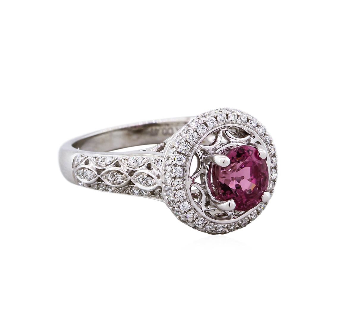 One stunning spinel and diamond ring set in 18KT white gold weighing 6.20 grams containing a 1.69 carat round prong-set spinel center stone beautifully showcased by ninety-four round diamonds with a total weight of 0.47 carats.