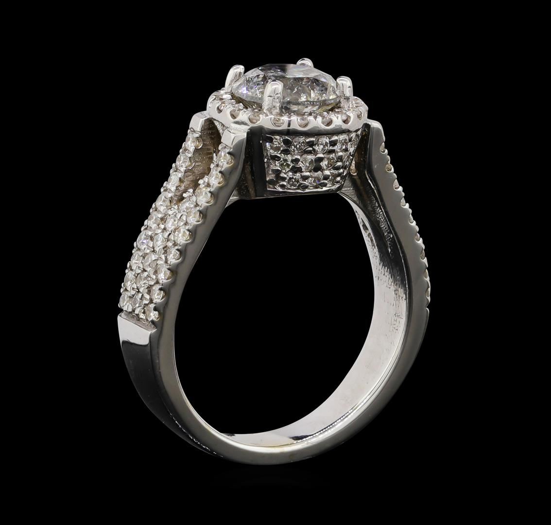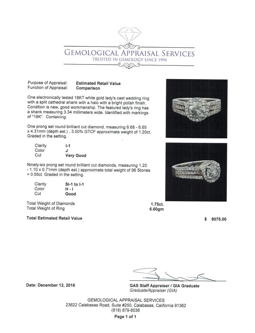 One electronically tested 18KT white gold lady's cast wedding ring with a split cathedral shank with a halo with a bright polish finish. The featured lady's ring has a shank measuring 3.34 millimeters wide. Identified with markings of "18K". Condition is new, good workmanship. Containing: One prong set round brilliant cut diamond, measuring 6.68 - 6.65 x 4.31mm (depth est.) , 3.00.%. GTCF approximate weight of 1.20ct. Graded in the setting. Clarity: I-1. Color: JCut Very Good Ninety-Six prong set round brilliant cut diamonds, measuring 1.20 - 1.10 x 0.71mm (depth est.) approximate total weight of 96 Stones = 0.55ct. Graded in the setting. Clarity: SI-1 to I-1. Color: H - ICut Good. Total Weight of Diamonds 1.75ct. Total Weight of Ring 6.60gm. GAS Appraised at $8,075.00.