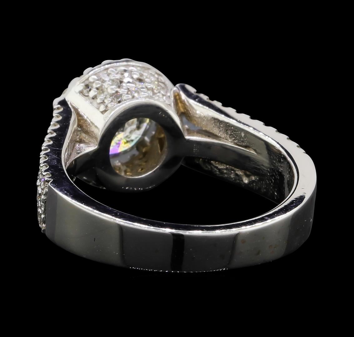 One electronically tested 18KT white gold lady's cast wedding ring with a split cathedral shank with a halo with a bright polish finish. The featured lady's ring has a shank measuring 3.34 millimeters wide. Identified with markings of "18K". Condition is new, good workmanship. Containing: One prong set round brilliant cut diamond, measuring 6.68 - 6.65 x 4.31mm (depth est.) , 3.00.%. GTCF approximate weight of 1.20ct. Graded in the setting. Clarity: I-1. Color: JCut Very Good Ninety-Six prong set round brilliant cut diamonds, measuring 1.20 - 1.10 x 0.71mm (depth est.) approximate total weight of 96 Stones = 0.55ct. Graded in the setting. Clarity: SI-1 to I-1. Color: H - ICut Good. Total Weight of Diamonds 1.75ct. Total Weight of Ring 6.60gm. GAS Appraised.