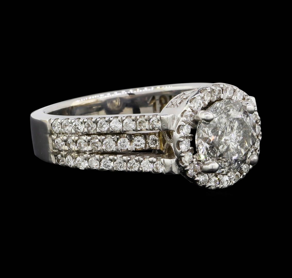 One electronically tested 18KT white gold lady's cast wedding ring with a split cathedral shank with a halo with a bright polish finish. The featured lady's ring has a shank measuring 3.34 millimeters wide. Identified with markings of "18K". Condition is new, good workmanship. Containing: One prong set round brilliant cut diamond, measuring 6.68 - 6.65 x 4.31mm (depth est.) , 3.00.%. GTCF approximate weight of 1.20ct. Graded in the setting. Clarity: I-1. Color: JCut Very Good Ninety-Six prong set round brilliant cut diamonds, measuring 1.20 - 1.10 x 0.71mm (depth est.) approximate total weight of 96 Stones = 0.55ct. Graded in the setting. Clarity: SI-1 to I-1. Color: H - ICut Good. Total Weight of Diamonds 1.75ct. Total Weight of Ring 6.60gm. GAS Appraised.