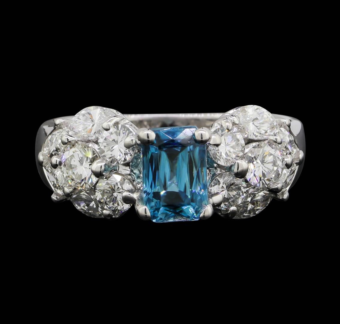One electronically tested 18KT white gold lady's cast fashion ring with a tapered shank with a bright polish finish. The featured lady's ring has a bow motif top section and a shank measuring 2.50 millimeters wide. Identified with markings of "K18". Condition is new, good workmanship. Containing: One prong set rectangular modified brilliant cut natural blue zircon, measuring 6.88 x 4.65 x 4.31mm, (depth est.) approximate weight of 1.80ct., clarity is eye clean, medium, moderately strong, green blue color, (GIA GB 5/4), cut is good. Transmitting light with no distortion, transparent. Colored gemstones are presumed to have been subjected to commonly used enhancement processes. Graded in the setting. Two prong set round brilliant cut diamonds, measuring 3.35 - 3.30 x 2.07mm (depth est.) approximate total weight of 2 Stones = 0.28ct. Graded in the setting. Clarity: VS-2 to SI-1. Color: H - ICut Very Good Four prong set round brilliant cut diamonds, measuring 3.10 - 3.00 x 1.89mm (depth est.) approximate total weight of 4 Stones = 0.44ct. Graded in the setting. Clarity: VS-1 to VS-2. Color: H - ICut Very Good Four prong set marquise shaped cut diamonds, measuring 4.70 x 2.70 x 1.70mm (depth est.) approximate total weight of 4 Stones = 0.50ct. Graded in the setting. Clarity: SI-1 to SI-2. Color: G - HCut Good Four prong set marquise shaped cut diamonds, measuring 4.00 x 2.20 x 1.39mm (depth est.) approximate total weight of 4 Stones = 0.30ct. Graded in the setting. Clarity: SI-1 to SI-2. Color: H - ICut Good. Total Weight of Colored Stones 1.80ct. Total Weight of Diamonds 1.52ct. Total Weight of Ring 5.40gm. GAS Appraised.