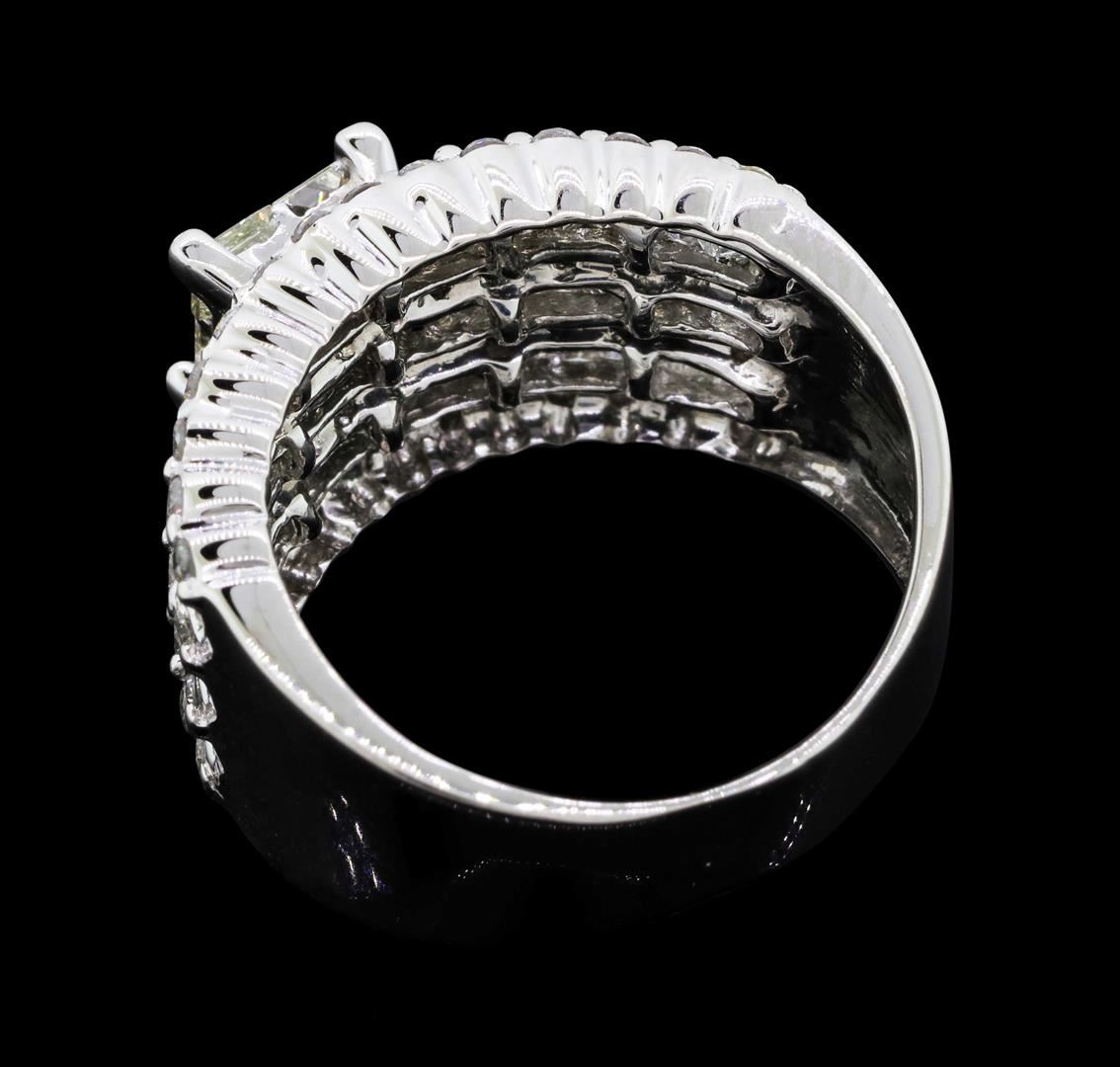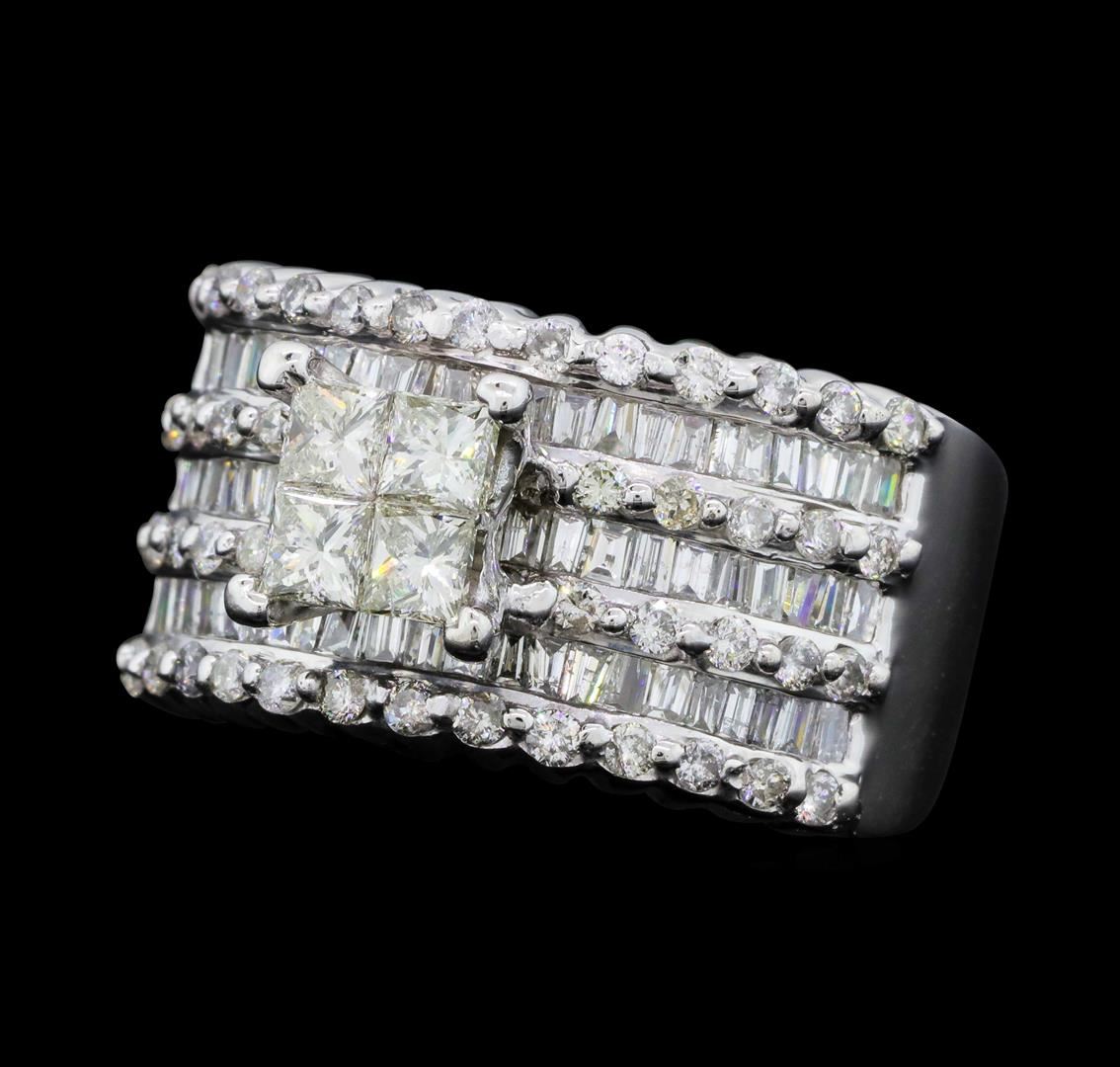One electronically tested 18KT white gold lady's combination cast & assembled fashion ring with a tapered wide band with a bright polish finish. The featured lady's ring has a shank measuring 5.20 millimeters wide. Identified with markings of "18K 750". Condition is new, good workmanship. Containing: Four invisible set princess cut diamonds, measuring 2.70 x 2.60 x 1.95mm (depth est.) approximate total weight of 4 Stones = 0.45ct. Graded in the setting. Color I - JClarity VS-1 to VS-2 Cut Very Good Fifty-Six prong set round brilliant cut diamonds, measuring 1.30 - 1.20 x 0.78mm (depth est.) approximate total weight of 56 Stones = 0.42ct. Graded in the setting. Color H - I Clarity SI-1 to I-1 Cut Good Seventy-Two channel set baguette cut (tapered) diamonds, measuring from 1.40 x 1.00 x 0.85mm (depth est.) to 1.70 x 1.10 x 0.94mm (depth est.) approximate total weight of 72 Stones = 0.98ct. Graded in the setting. Color H - I Clarity SI-1 to I-1 Cut Good. Total Weight of Diamonds 1.85ct. Total Weight of Ring 7.00gm. GAS Appraised.