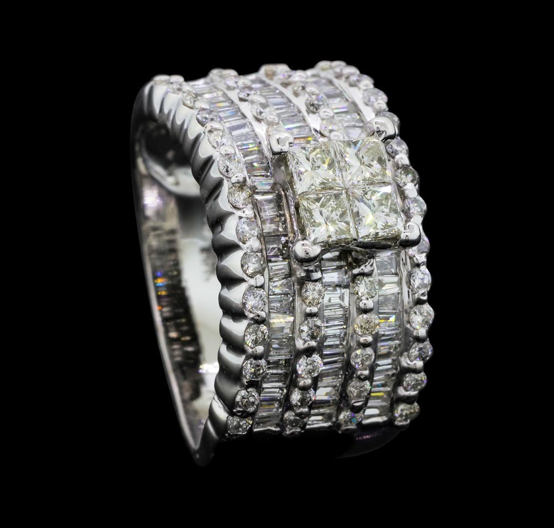 One electronically tested 18KT white gold lady's combination cast & assembled fashion ring with a tapered wide band with a bright polish finish. The featured lady's ring has a shank measuring 5.20 millimeters wide. Identified with markings of "18K 750". Condition is new, good workmanship. Containing: Four invisible set princess cut diamonds, measuring 2.70 x 2.60 x 1.95mm (depth est.) approximate total weight of 4 Stones = 0.45ct. Graded in the setting. Color I - JClarity VS-1 to VS-2 Cut Very Good Fifty-Six prong set round brilliant cut diamonds, measuring 1.30 - 1.20 x 0.78mm (depth est.) approximate total weight of 56 Stones = 0.42ct. Graded in the setting. Color H - I Clarity SI-1 to I-1 Cut Good Seventy-Two channel set baguette cut (tapered) diamonds, measuring from 1.40 x 1.00 x 0.85mm (depth est.) to 1.70 x 1.10 x 0.94mm (depth est.) approximate total weight of 72 Stones = 0.98ct. Graded in the setting. Color H - I Clarity SI-1 to I-1 Cut Good. Total Weight of Diamonds 1.85ct. Total Weight of Ring 7.00gm. GAS Appraised.