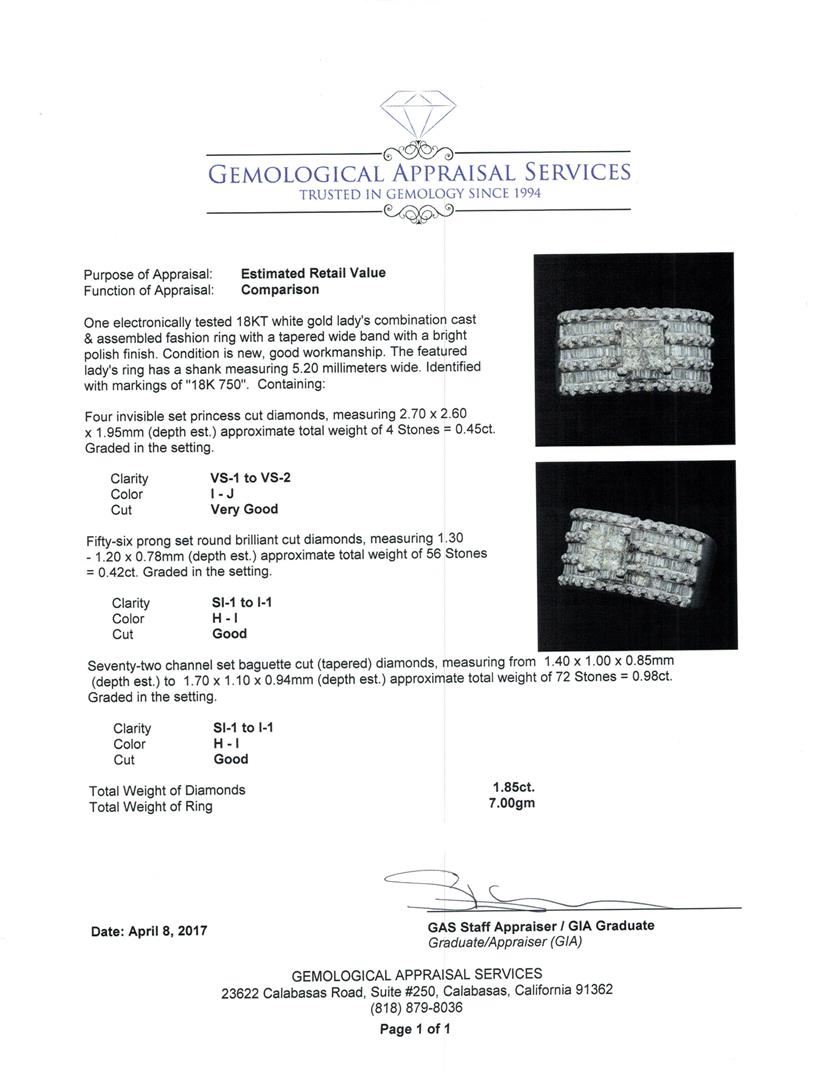 One electronically tested 18KT white gold lady's combination cast & assembled fashion ring with a tapered wide band with a bright polish finish. The featured lady's ring has a shank measuring 5.20 millimeters wide. Identified with markings of "18K 750". Condition is new, good workmanship. Containing: Four invisible set princess cut diamonds, measuring 2.70 x 2.60 x 1.95mm (depth est.) approximate total weight of 4 Stones = 0.45ct. Graded in the setting. Color I - JClarity VS-1 to VS-2 Cut Very Good Fifty-Six prong set round brilliant cut diamonds, measuring 1.30 - 1.20 x 0.78mm (depth est.) approximate total weight of 56 Stones = 0.42ct. Graded in the setting. Color H - I Clarity SI-1 to I-1 Cut Good Seventy-Two channel set baguette cut (tapered) diamonds, measuring from 1.40 x 1.00 x 0.85mm (depth est.) to 1.70 x 1.10 x 0.94mm (depth est.) approximate total weight of 72 Stones = 0.98ct. Graded in the setting. Color H - I Clarity SI-1 to I-1 Cut Good. Total Weight of Diamonds 1.85ct. Total Weight of Ring 7.00gm. GAS Appraised.