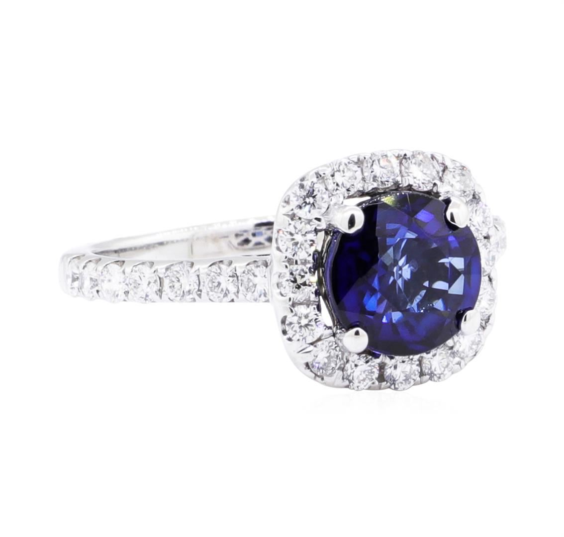 One electronically tested 18KT white gold lady's cast fashion ring with a square cushion halo with a bright polish finish. The featured lady's ring has a shank measuring 1.68 millimeters wide. Identified with markings of '18K 750'. Condition is new, good workmanship. Containing: One prong set round modified mixed cut natural blue sapphire, measuring 6.71 - 6.64 x 4.20 mm, (depth est.) approximate weight of 1.48ct., clarity is eye clean, medium dark, moderately strong, blue color, (GIA B 6/4), cut is very good. Transmitting light with no distortion, transparent. Colored gemstones are presumed to have been subjected to commonly used enhancement processes. Graded in the setting. Thirty prong set round brilliant cut diamonds, measuring 1.60 - 1.55 x 0.98mm (depth est.) approximate total weight of 30 Stones = 0.45ct. Graded in the setting. Color G - H Clarity SI-1 to SI-2 Cut Good. Total Weight of Colored Stones 1.48ct. Total Weight of Diamonds 0.45ct. Total Weight of Ring 2.80gm. GAS Appraised.