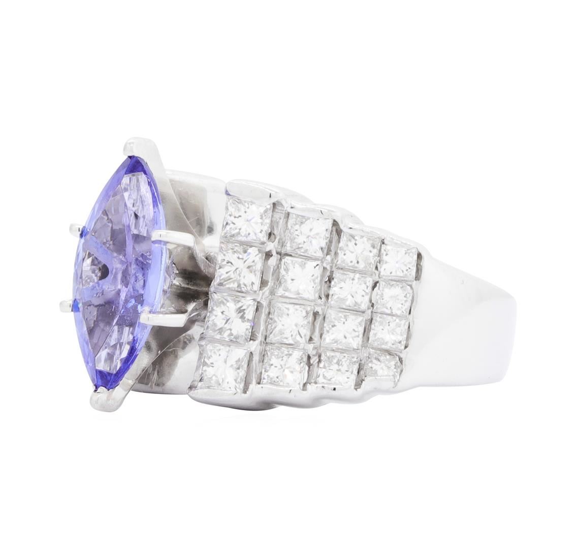 One electronically tested 18KT white gold Ladies cast fashion ring with a tapered shank with a bright polish finish. The featured Ladies ring has a shank measuring 3.90 millimeters wide. Identified with markings of '18K'. Condition is new, good workmanship. Containing: One prong set marquise modified brilliant cut natural tanzanite, measuring 12.90 x 6.35 x 3.40mm, (depth est.) 10%. bulge factor, approximate weight of 1.95ct., clarity is slightly included, medium light, very slightly grayish, violetish blue color, (GIA vB 4/3), cut is good. Transmitting light with a minimum of distortion, transparent. Colored gemstones are presumed to have been subjected to commonly used enhancement processes. Graded in the setting. Thirty-Two invisible set princess cut diamonds, measuring 2.80 x 2.10 x 1.58mm (depth est.) approximate total weight of 32 Stones = 2.80ct. Graded in the setting. Color G - H Clarity VS-2 to SI-2 Cut Good. Total Weight of Colored Stones 1.95ct. Total Weight of Diamonds 2.80ct. Total Weight of Ring 13.40gm. GAS Appraised.