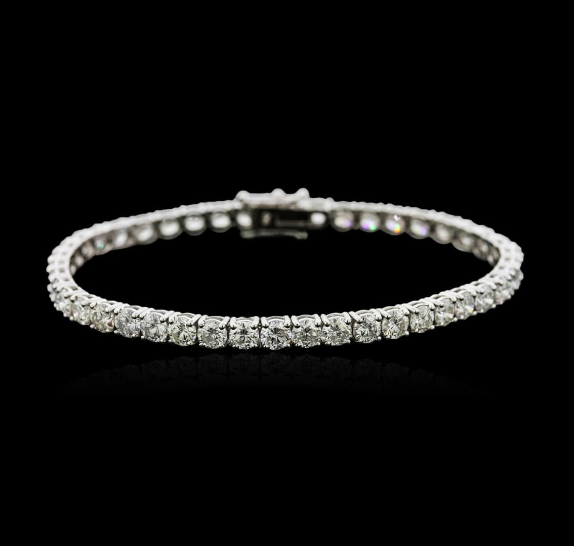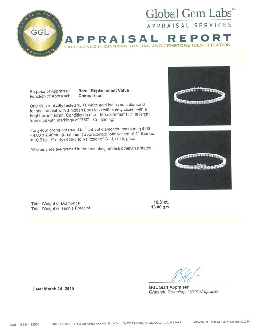 One electronically tested 18KT white gold ladies cast diamond tennis bracelet with a hidden box clasp with safety closer with a bright polish finish. Measurements: 7" in length Identified with markings of "750". Condition is new. Containing: Forty-Four prong set round brilliant cut diamonds, measuring 4.00 - 4.00 x 2.40mm (depth est.) approximate total weight of 44 Stones = 10.31ct. Clarity: SI-2 to I-1. Color: G - I, Cut is Good. All diamonds are graded in the mounting, unless otherwise stated. Total Weight of Diamonds 10.31ct. Total Weight of Tennis Bracelet 13.80 grams. GGL Appraised.