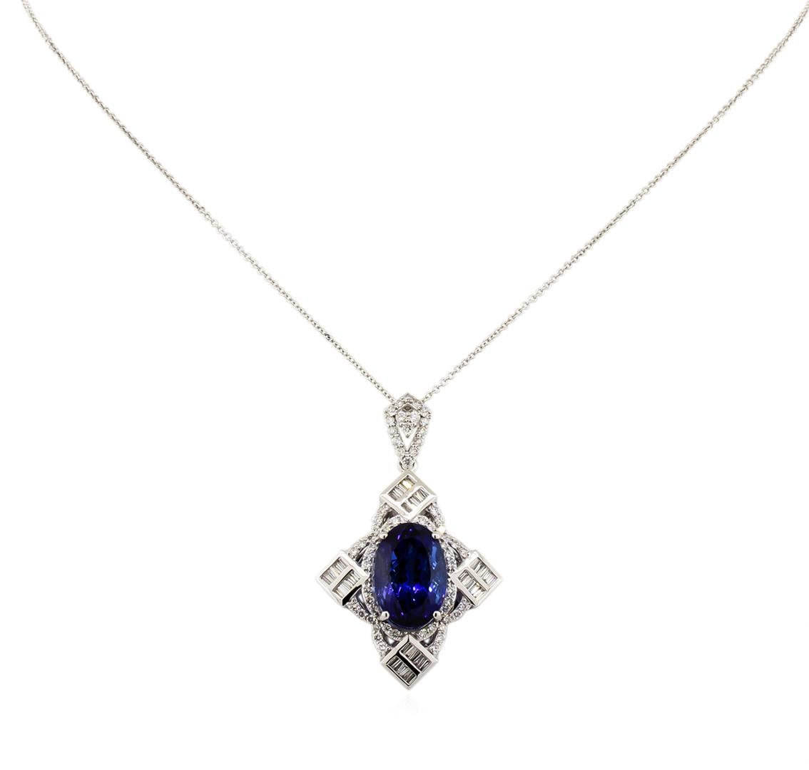 Gorgeous tanzanite and diamond necklace featuring 11.00 grams of 18KT white gold. 1.67 carats of baguette and round diamonds intricately frame the impressive 12.43 carat tanzanite center stone for a truly remarkable necklace.