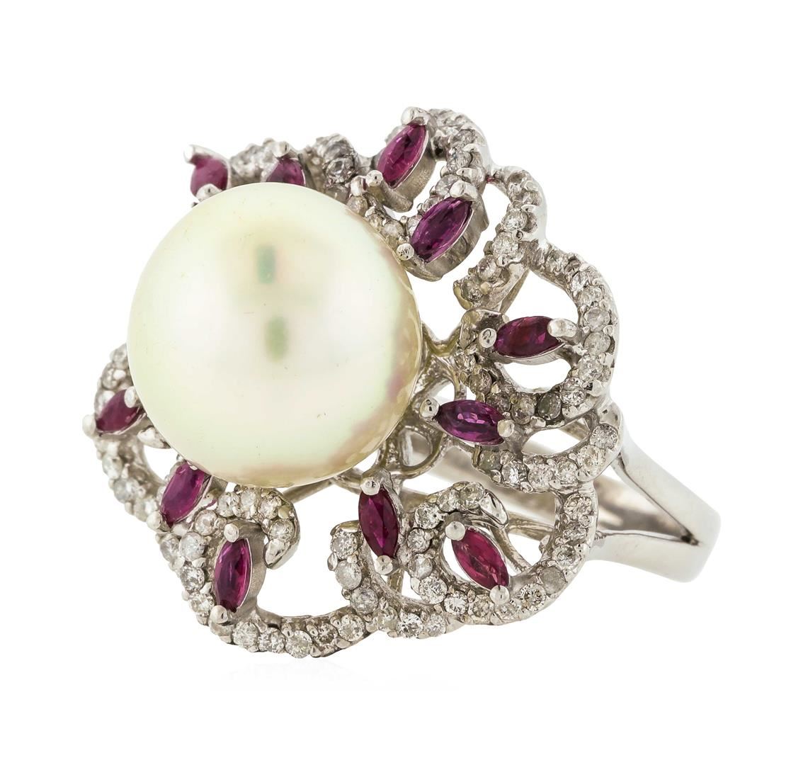 One 18KT White Gold 12.7mm Pearl and Diamond Ring with a total weight of 13.8 grams. Diamonds with a total weight of 0.90cts. 12 Rubies with a total weight of 0.50cts. GGA Appraised at $4,860.00.