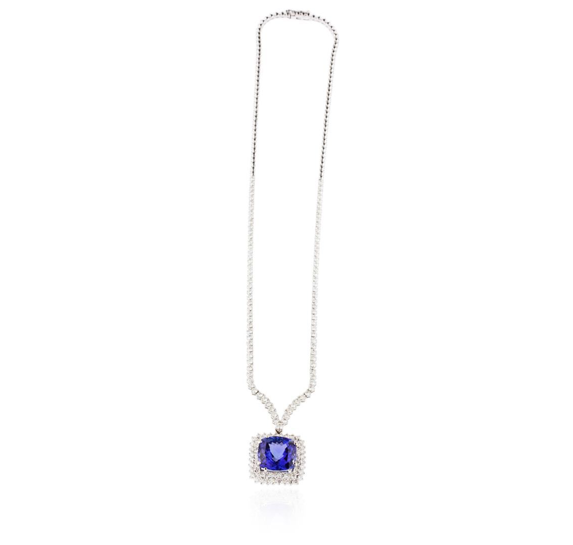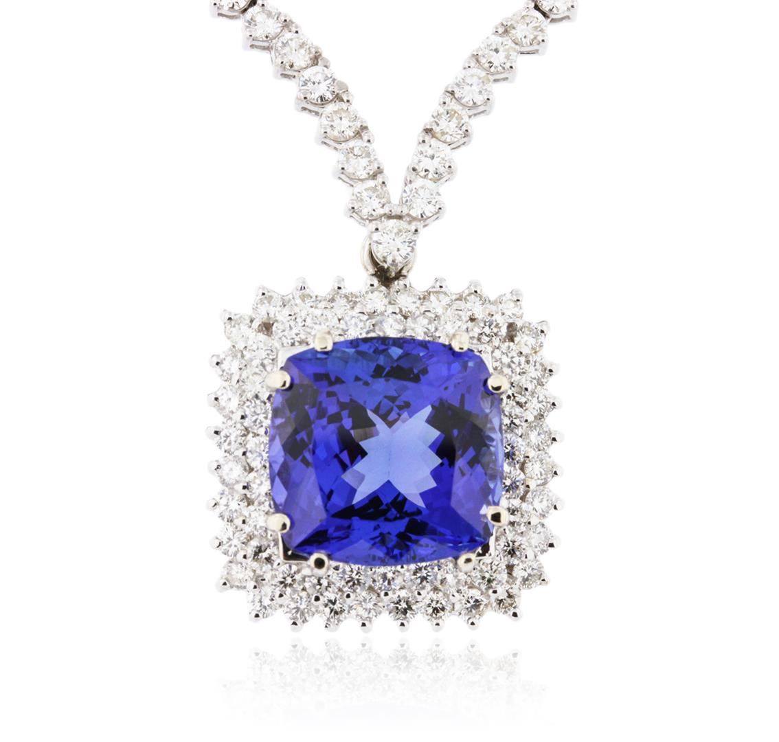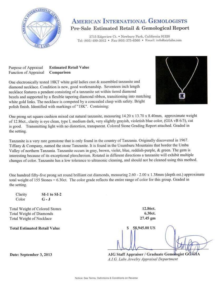 One electronically tested 18KT white gold ladies cast & assembled tanzanite and diamond necklace. Condition is new, good workmanship. Seventeen inch length necklace features a pendant consisting of a tanzanite set within tiered diamond bezels and supported by a flexible tapering diamond ribbon, transitioning into matching white gold links. The necklace is competed by a concealed clasp with safety. Bright polish finish. Identified with markings of "18K". Containing: One prong set square cushion mixed cut natural tanzanite, measuring 14.20 x 13.70 x 8.40mm, approximate weight of 12.86ct., clarity is eye clean, type I, medium dark, very slightly grayish, violetish blue color, (GIA vB 6/3), cut is good. Transmitting light with no distortion, transparent. Colored Stone Grading Report attached. Graded in the setting. Tanzanite is a very rare gemstone that is only found in the country of Tanzania. Originally discovered in 1967. Tiffany & Company, named the stone Tanzanite. It is found in the Usumburu Mountains that border the Umba Valley of northern Tanzania. Tanzanite occurs in gray, brown, violet, blue, reddish-purple, & green. The gem is interesting because of its exceptional pleochroism. Rotated in different directions a tanzanite will exhibit multiple changes of color. Tanzanite has a low tolerance to ultrasonic cleaning, and should not be cleaned using this method. One hundred fifty-five prong set round brilliant cut diamonds, measuring 2.60 - 2.00 x 1.38mm (depth est.) approximate total weight of 155 Stones = 6.30ct. The color grade reflects the entire range of color for this group. Graded in the setting. Clarity SI-1 to SI-2. Color G -- J. Total Weight of Colored Stones 12.86ct. Total Weight of Diamonds 6.30ct. Total Weight of Necklace 27.45gm. AIG Appraised at $58,945.00.