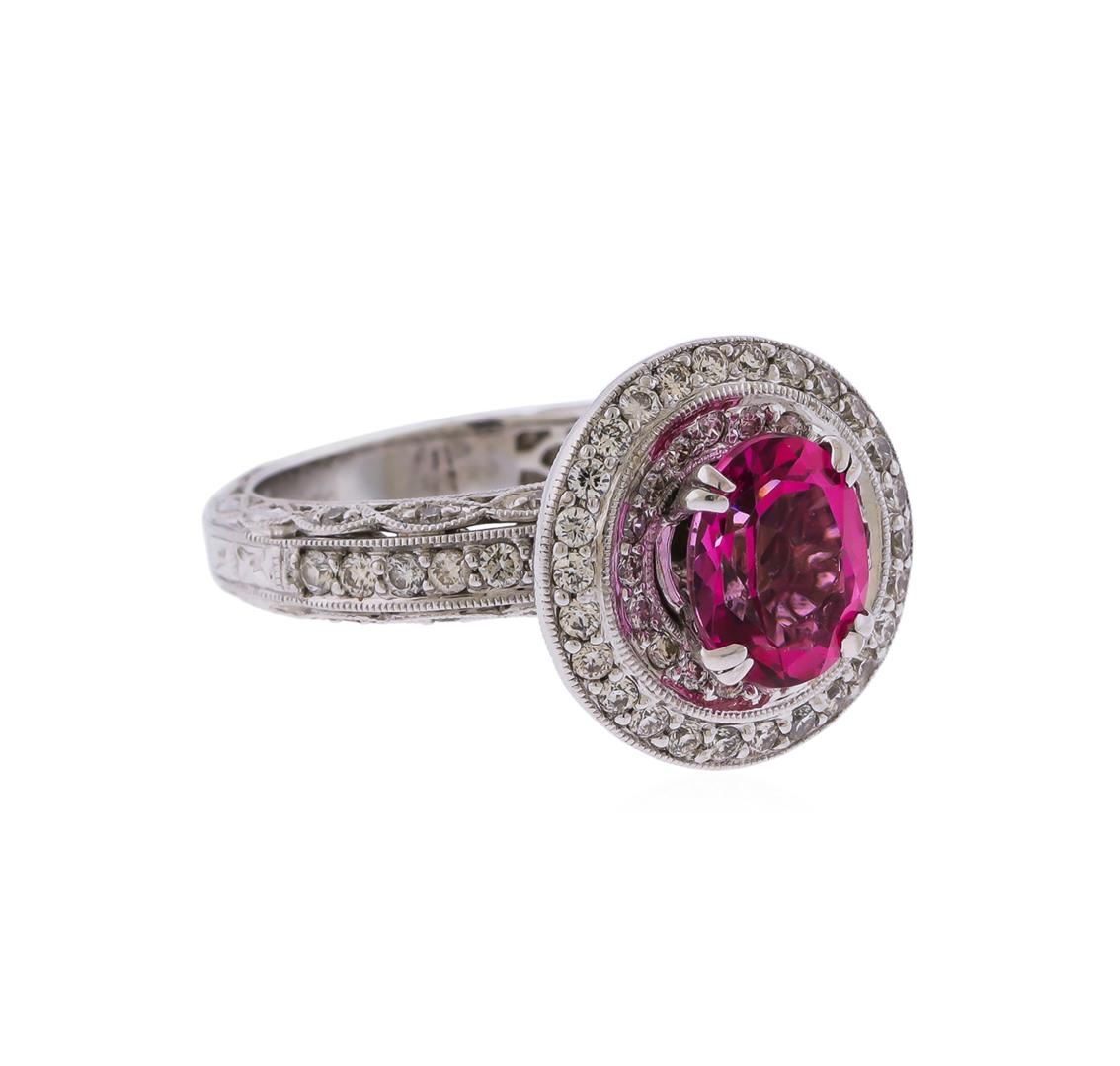 Eighteen karat (18K) white gold pink topaz and diamond ring. The center contains an oval cut pink topaz gemstone, weighing approximately 2.00cts, that is prong mounted in the center of the ring. Round brilliant cut diamonds accent the around and on both sides of the center gemstone with a total approximate weight of .90ctw. The ring is cast stamped "18K" and has a gross weight of 9.4 Grams GGA Appraised.
