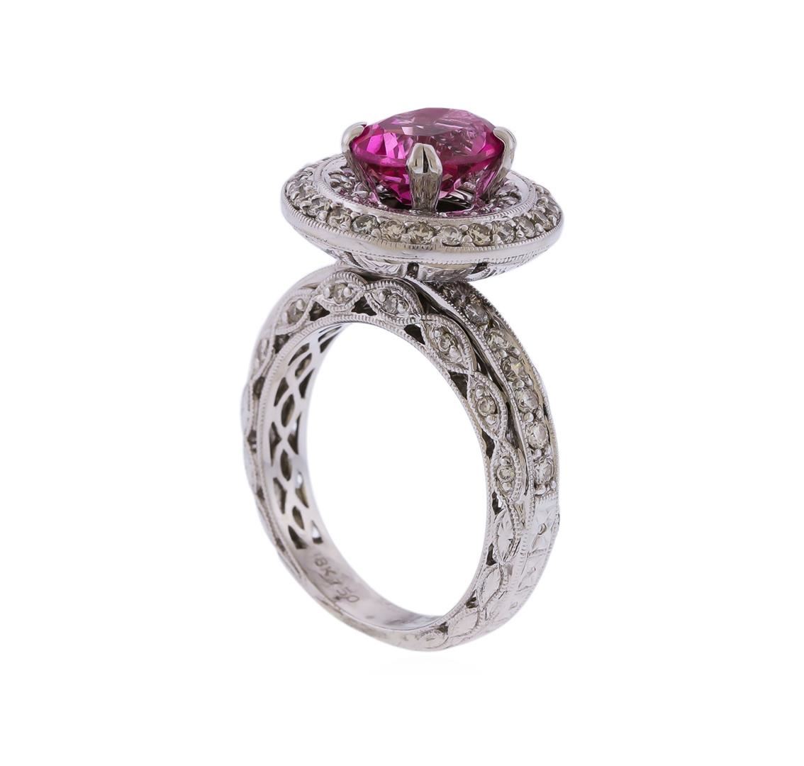 Eighteen karat (18K) white gold pink topaz and diamond ring. The center contains an oval cut pink topaz gemstone, weighing approximately 2.00cts, that is prong mounted in the center of the ring. Round brilliant cut diamonds accent the around and on both s GGA Appraised at $4,620.00.