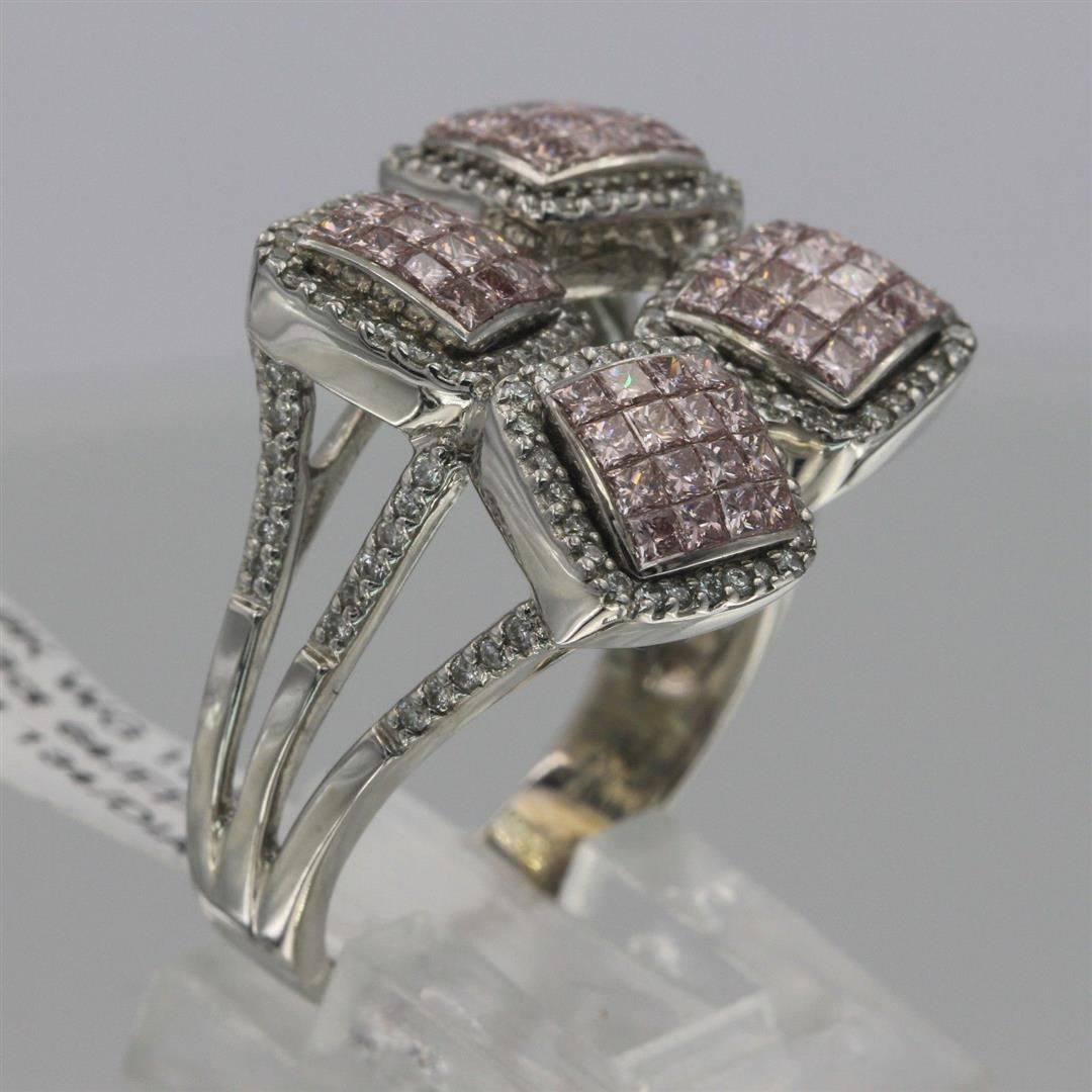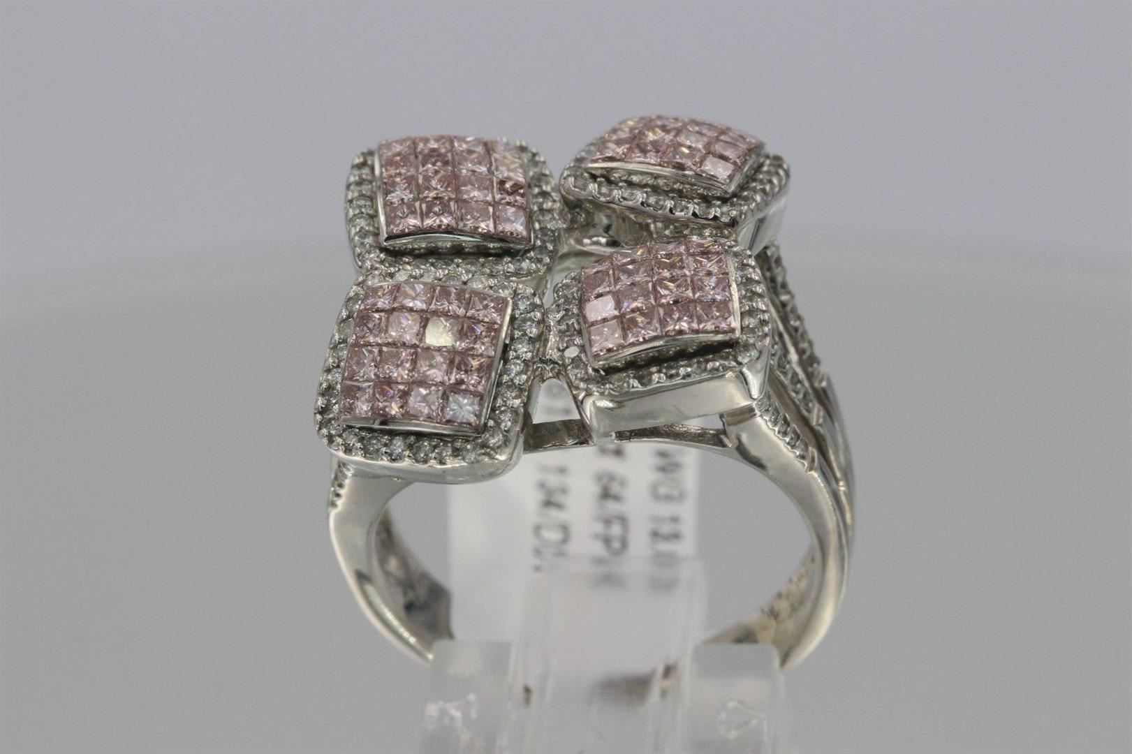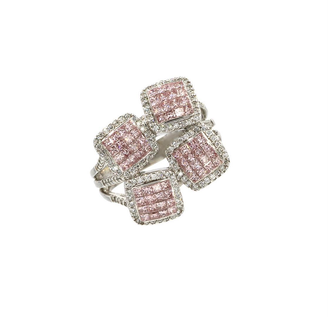 One Fancy Pink Diamond Ring Princess Cut 4-Square Bridal Ring in 18k White Gold. Total carat weight of ring is 2.04 carats. Gross weight is 13.88 grams with a total 198 stones. Size is 8.25 but can be resized free of charge. Condition is brand new. Main stone is color enhanced and natural. Main diamond carat is 1.43 carats, shape is princess cut, clarity fine medium, and color is fancy pink. Main diamond cut is excellent. Side diamonds are natural and non-enhanced. Side diamonds total carats is 0.61 carats, shape is round cut, clarity SI1, color G-H, and cut is excellent with a total of 134 side diamonds.