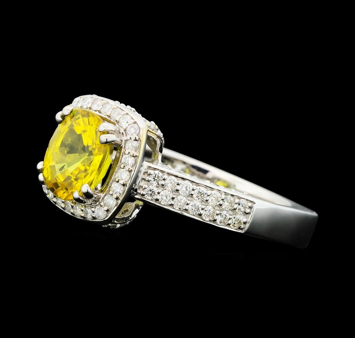One electronically tested 18KT white gold ladies cast yellow sapphire and diamond ring with a bright polish finish. The featured yellow sapphire is set within a diamond bezel supported by a diamond accented under gallery and diamond set shoulders, completed by an European style three millimeter wide band. Trademark is Orianne. Identified with markings of "18K". Condition is new, good workmanship. Containing: One prong set rectangular cushion mixed cut natural yellow sapphire approximate weight of 2.11ct., clarity is eye clean, type II, medium dark, slightly brownish, yellow color, (GIA Y 6/2), cut is good. Transmitting light with no distortion, transparent. Gradedin the setting.Eighty-Four prong set round brilliant cut diamonds approximate total weight of 84 Stones = 0.66ct. Graded in the setting. Clarity: I-1 to I-2. Color: F - H. Total Weight of Colored Stones 2.11ct. Total Weight of Diamonds 0.66ct. Total Weight of Ring 5.65gm. AIG Appraised.