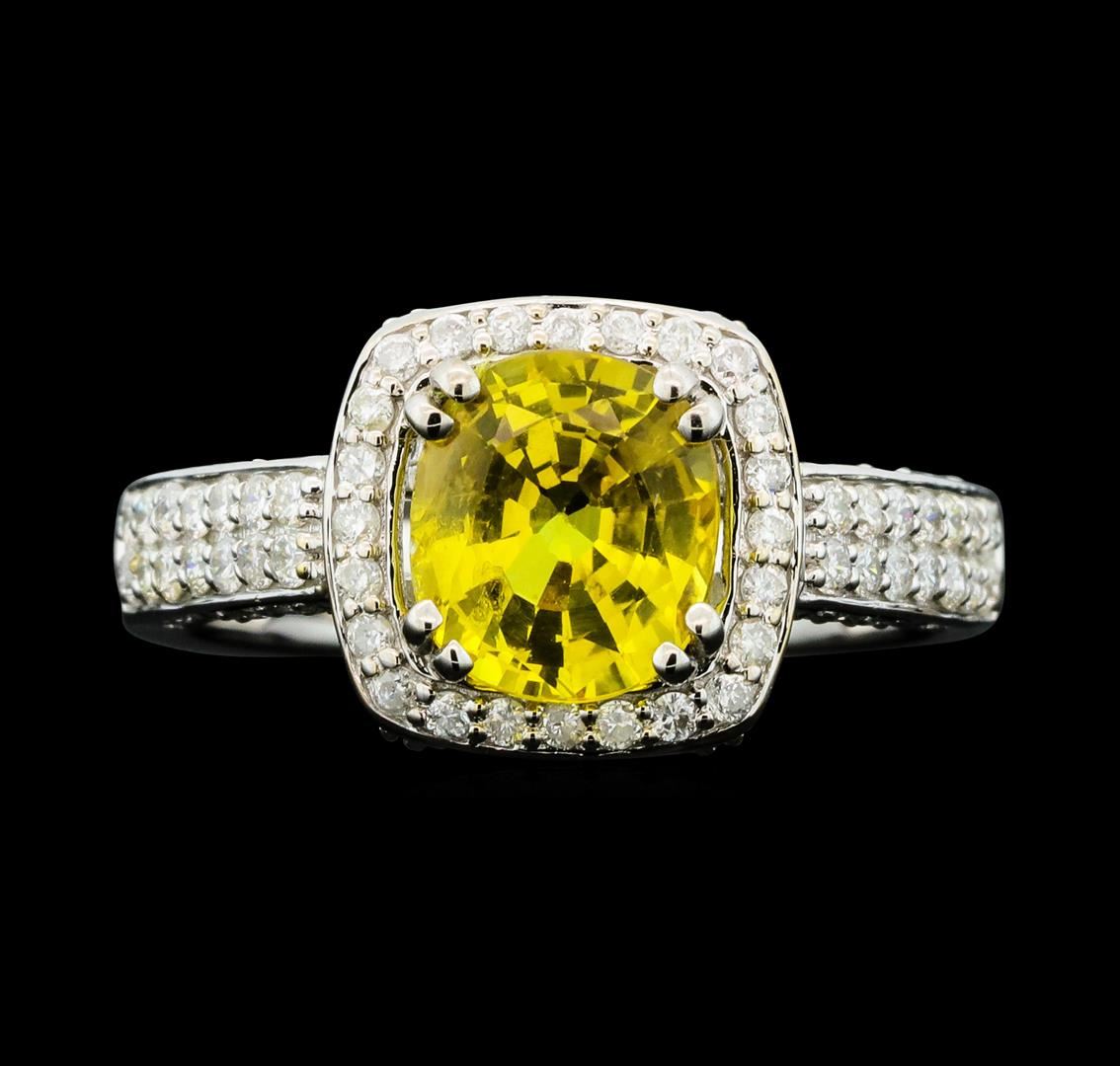 One electronically tested 18KT white gold ladies cast yellow sapphire and diamond ring with a bright polish finish. The featured yellow sapphire is set within a diamond bezel supported by a diamond accented under gallery and diamond set shoulders, completed by an European style three millimeter wide band. Trademark is Orianne. Identified with markings of "18K". Condition is new, good workmanship. Containing: One prong set rectangular cushion mixed cut natural yellow sapphire approximate weight of 2.11ct., clarity is eye clean, type II, medium dark, slightly brownish, yellow color, (GIA Y 6/2), cut is good. Transmitting light with no distortion, transparent. Gradedin the setting.Eighty-Four prong set round brilliant cut diamonds approximate total weight of 84 Stones = 0.66ct. Graded in the setting. Clarity: I-1 to I-2. Color: F - H. Total Weight of Colored Stones 2.11ct. Total Weight of Diamonds 0.66ct. Total Weight of Ring 5.65gm. AIG Appraised.