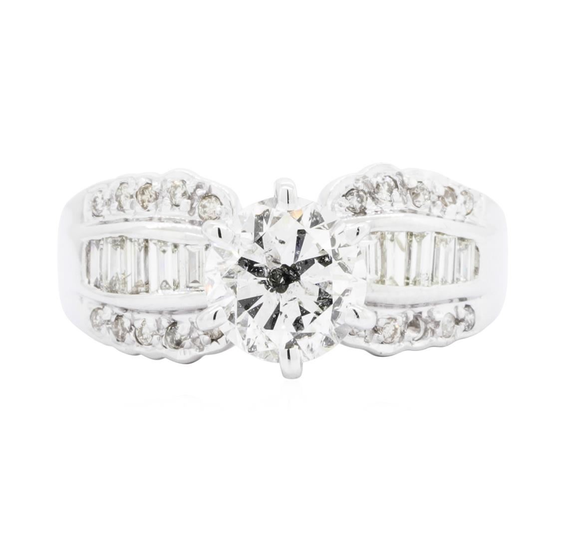 One electronically tested 18KT white gold Ladies cast wedding ring with a tapered shank with a bright polish finish. The featured Ladies ring has a shank measuring 2.87 millimeters wide. Identified with markings of '18K'. Condition is new, good workmanship. Containing: One prong set round brilliant cut diamond, measuring 7.38 - 7.25 x 4.70mm (depth est.) approximate weight of 1.53ct. Graded in the setting. Color J - K Clarity I-1 Cut Good Ten channel set baguette cut diamonds, measuring from 2.50 x 1.40 x 1.19mm (depth est.) to 2.80 x 1.70 x 1.45mm (depth est.) approximate total weight of 10 Stones = 0.50ct. Graded in the setting. Color H - I Clarity VS-1 to SI-1 Cut Good Twenty prong set round brilliant cut diamonds, measuring 1.20 - 1.10 x 0.71mm (depth est.) approximate total weight of 20 Stones = 0.12ct. Graded in the setting. Color H - K Clarity SI-2 to I-2 Cut Good. Total Weight of Diamonds 2.15ct. Total Weight of Ring 7.10gm. GAS Appraised.