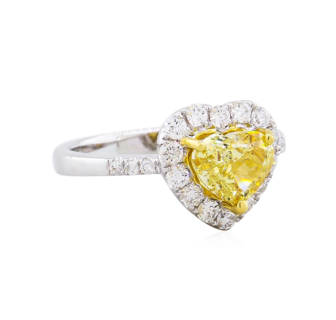 One electronically tested 18KT white gold ladies cast diamond ring with a bright polish finish. The featured diamond is set within an inner yellow gold basket and outer diamond bezel supported by diamond set shoulders, completed by a two millimeter wide band. Trademark is HANA. Identified with markings of "18K". Condition is new, good workmanship. Containing: One prong set heart shaped cut diamond, measuring 6.30 x 7.40 x 4.50mm (depth est.), 25.00.%. GTCF approximate weight of 1.72ct. Graded in the setting. Clarity: SI-2. Depth: 60.8%. Table 64.9%. Fourteen prong set round brilliant cut diamonds, measuring 2.00 - 2.00 x 1.20mm (depth est.) approximate. Total Weight of 14 Stones = 0.41ct. Graded in the setting. Clarity: SI-1 to SI-2. Color: G - I Six prong set round brilliant cut diamonds, measuring 1.40 - 1.40 x 0.84mm (depth est.) approximate. Total Weight of 6 Stones = 0.08ct. Graded in the setting. Clarity: SI-2 to I-1. Color: G - I. Total Weight of Diamonds 2.21ct. Total Weight of Ring 4.93gm. AIG Appraised at $25,190.00.