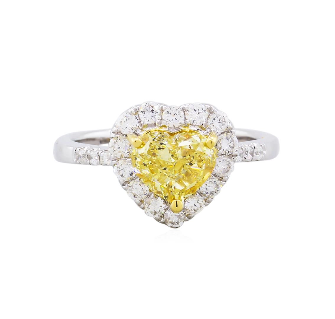 One electronically tested 18KT white gold ladies cast diamond ring with a bright polish finish. The featured diamond is set within an inner yellow gold basket and outer diamond bezel supported by diamond set shoulders, completed by a two millimeter wide band. Trademark is HANA. Identified with markings of "18K". Condition is new, good workmanship. Containing: One prong set heart shaped cut diamond, measuring 6.30 x 7.40 x 4.50mm (depth est.), 25.00.%. GTCF approximate weight of 1.72ct. Graded in the setting. Clarity: SI-2. Depth: 60.8%. Table 64.9%. Fourteen prong set round brilliant cut diamonds, measuring 2.00 - 2.00 x 1.20mm (depth est.) approximate. Total Weight of 14 Stones = 0.41ct. Graded in the setting. Clarity: SI-1 to SI-2. Color: G - I Six prong set round brilliant cut diamonds, measuring 1.40 - 1.40 x 0.84mm (depth est.) approximate. Total Weight of 6 Stones = 0.08ct. Graded in the setting. Clarity: SI-2 to I-1. Color: G - I. Total Weight of Diamonds 2.21ct. Total Weight of Ring 4.93gm. AIG Appraised at $25,190.00.