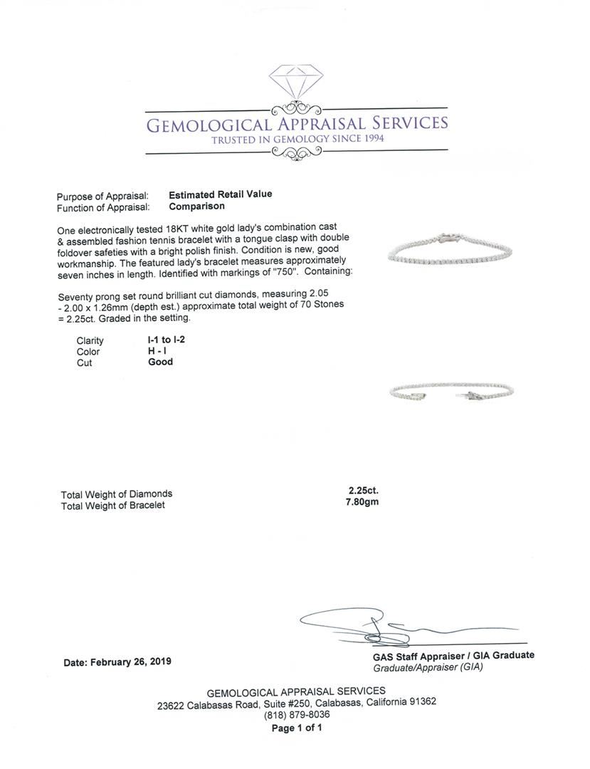 One electronically tested 18KT white gold lady's combination cast & assembled fashion tennis bracelet with a tongue clasp with double foldover safeties with a bright polish finish. The featured lady's bracelet measures approximately seven inches in length. Identified with markings of '750'. Condition is new, good workmanship. Containing: Seventy prong set round brilliant cut diamonds, measuring 2.05 - 2.00 x 1.26mm (depth est.) approximate total weight of 70 Stones = 2.25ct. Graded in the setting. Color H - I, Clarity I-1 to I-2, Cut Good. Total Weight of Diamonds 2.25ct. Total Weight of Bracelet 7.80gm. GAS Appraised.