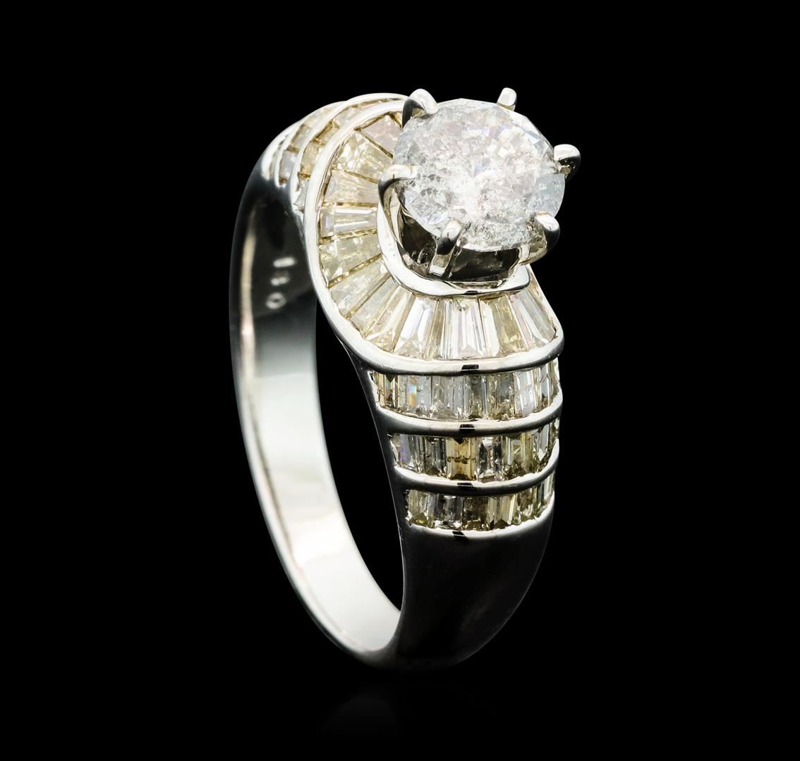 One electronically tested 18KT white gold ladies cast & assembled diamond unity ring with a bright finish. The featured diamond is set within a field of baguette cut diamonds, supported by tapering shoulders, completed by a three millimeter wide band. Identified with markings of "18K". Condition is new, good workmanship. Containing: One prong set round brilliant cut diamond, measuring 6.20 - 6.20 x 4.00mm (depth est.), 8.00.%. GTCF approximate weight of 1.02ct with a faint blue fluorescence. Clarity: I-2. Color: HDepth 64.5%. Table 64.8%. Seventy-Five channel set baguette cut (tapered) diamonds approximate total weight of 75 Stones = 1.30ct. Graded in the setting. Clarity: SI-1 to I-1. Color: I - K. Total Weight of Diamonds 2.32ct. Total Weight of Ring 4.83gm. AIG Appraised.