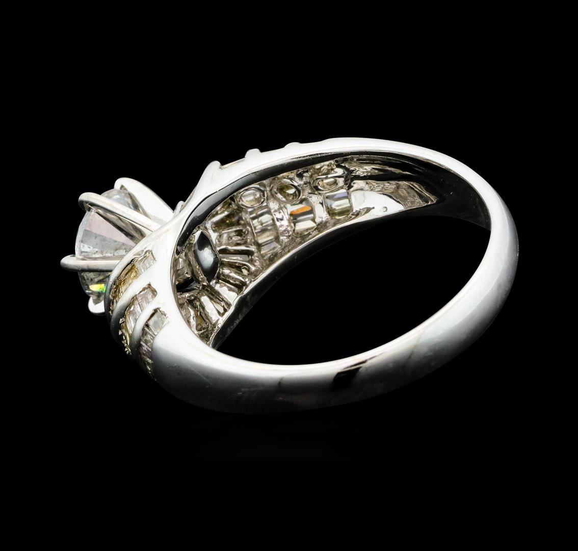 One electronically tested 18KT white gold ladies cast & assembled diamond unity ring with a bright finish. The featured diamond is set within a field of baguette cut diamonds, supported by tapering shoulders, completed by a three millimeter wide band. Identified with markings of "18K". Condition is new, good workmanship. Containing: One prong set round brilliant cut diamond, measuring 6.20 - 6.20 x 4.00mm (depth est.), 8.00.%. GTCF approximate weight of 1.02ct with a faint blue fluorescence. Clarity: I-2. Color: HDepth 64.5%. Table 64.8%. Seventy-Five channel set baguette cut (tapered) diamonds approximate total weight of 75 Stones = 1.30ct. Graded in the setting. Clarity: SI-1 to I-1. Color: I - K. Total Weight of Diamonds 2.32ct. Total Weight of Ring 4.83gm. AIG Appraised.