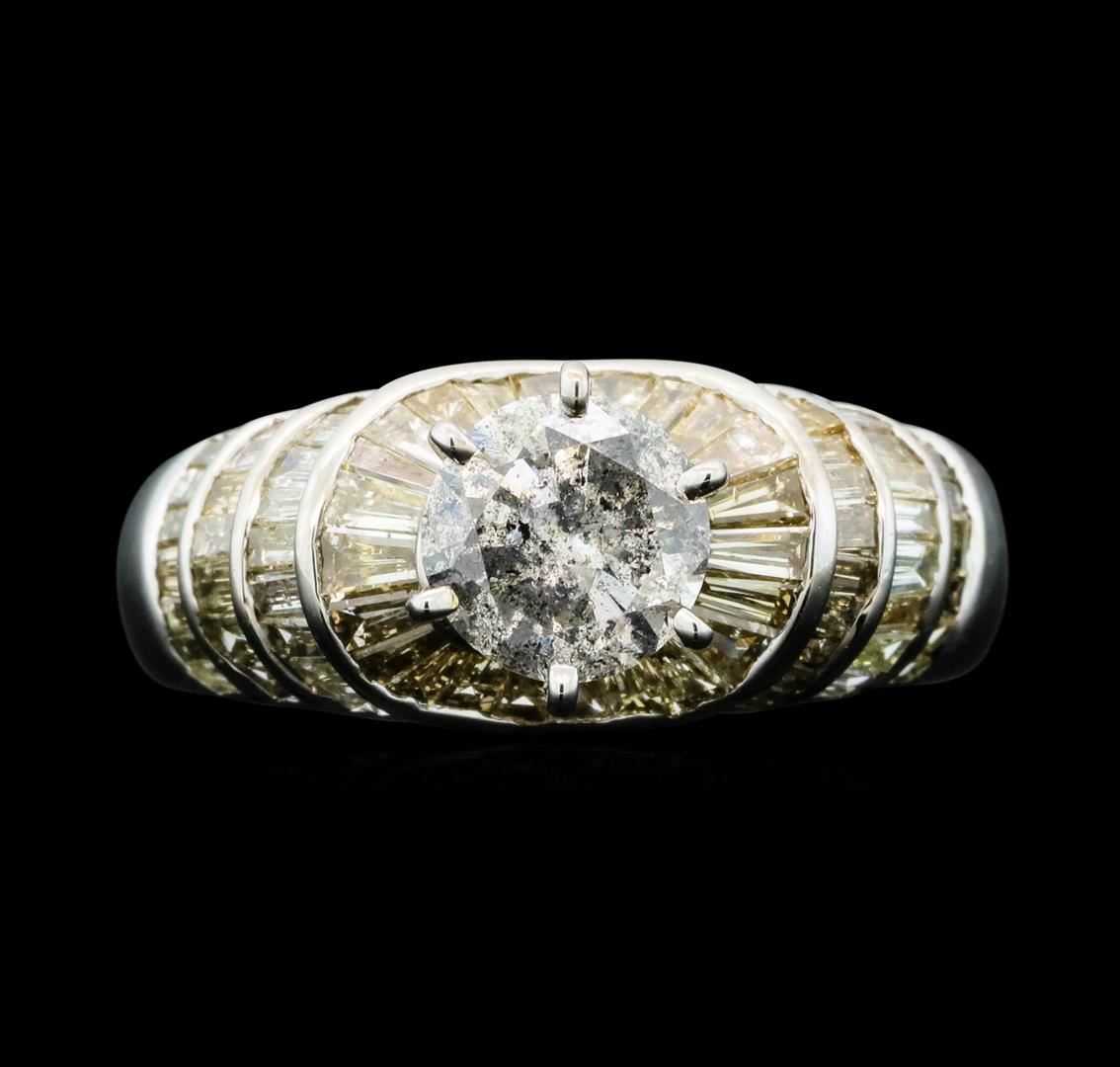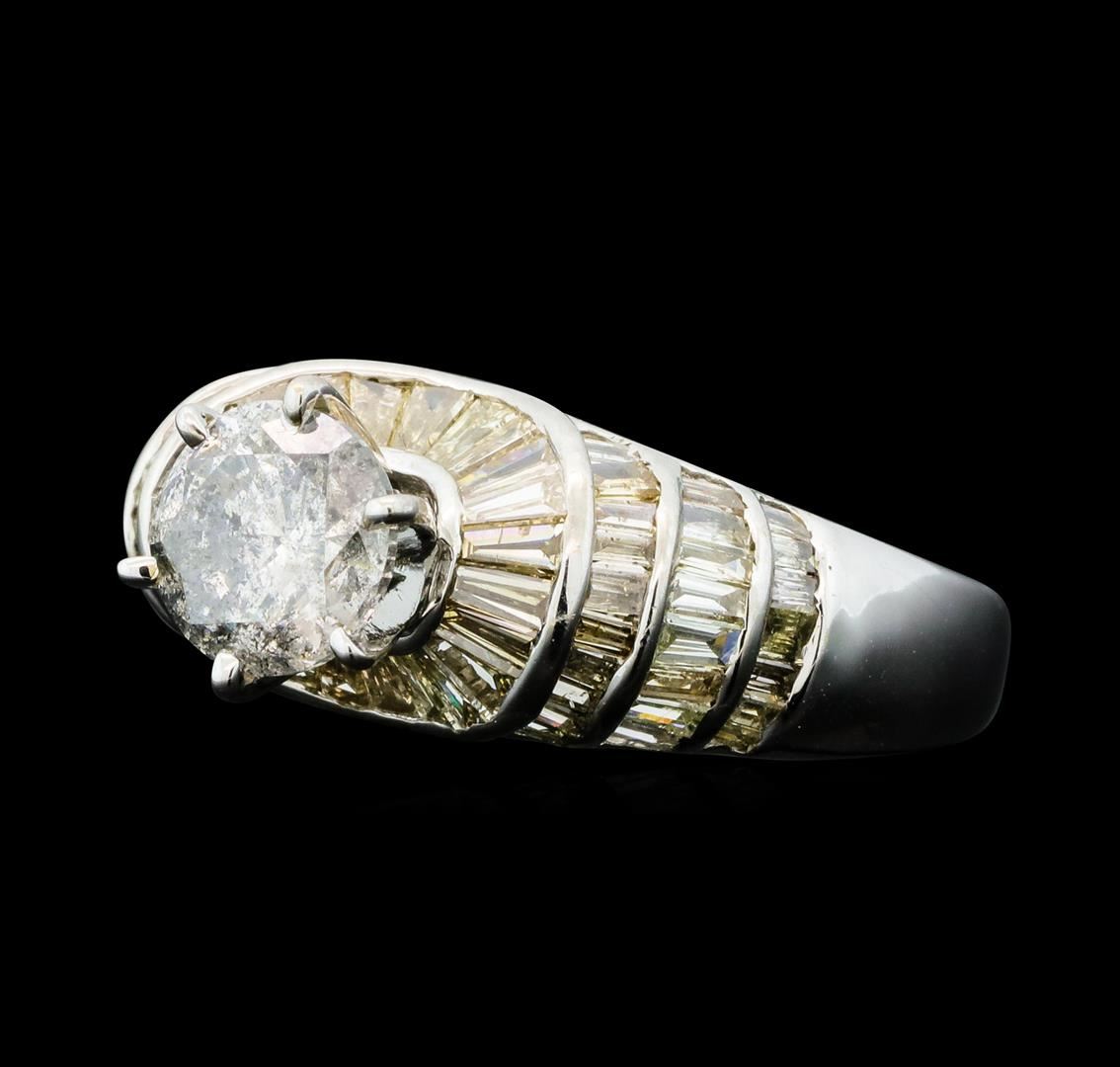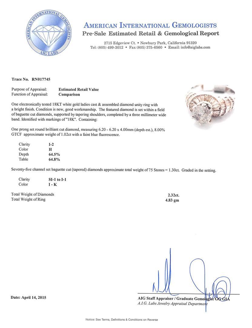 One electronically tested 18KT white gold ladies cast & assembled diamond unity ring with a bright finish. The featured diamond is set within a field of baguette cut diamonds, supported by tapering shoulders, completed by a three millimeter wide band. Identified with markings of "18K". Condition is new, good workmanship. Containing: One prong set round brilliant cut diamond, measuring 6.20 - 6.20 x 4.00mm (depth est.), 8.00.%. GTCF approximate weight of 1.02ct with a faint blue fluorescence. Clarity: I-2. Color: HDepth 64.5%. Table 64.8%. Seventy-Five channel set baguette cut (tapered) diamonds approximate total weight of 75 Stones = 1.30ct. Graded in the setting. Clarity: SI-1 to I-1. Color: I - K. Total Weight of Diamonds 2.32ct. Total Weight of Ring 4.83gm. AIG Appraised.