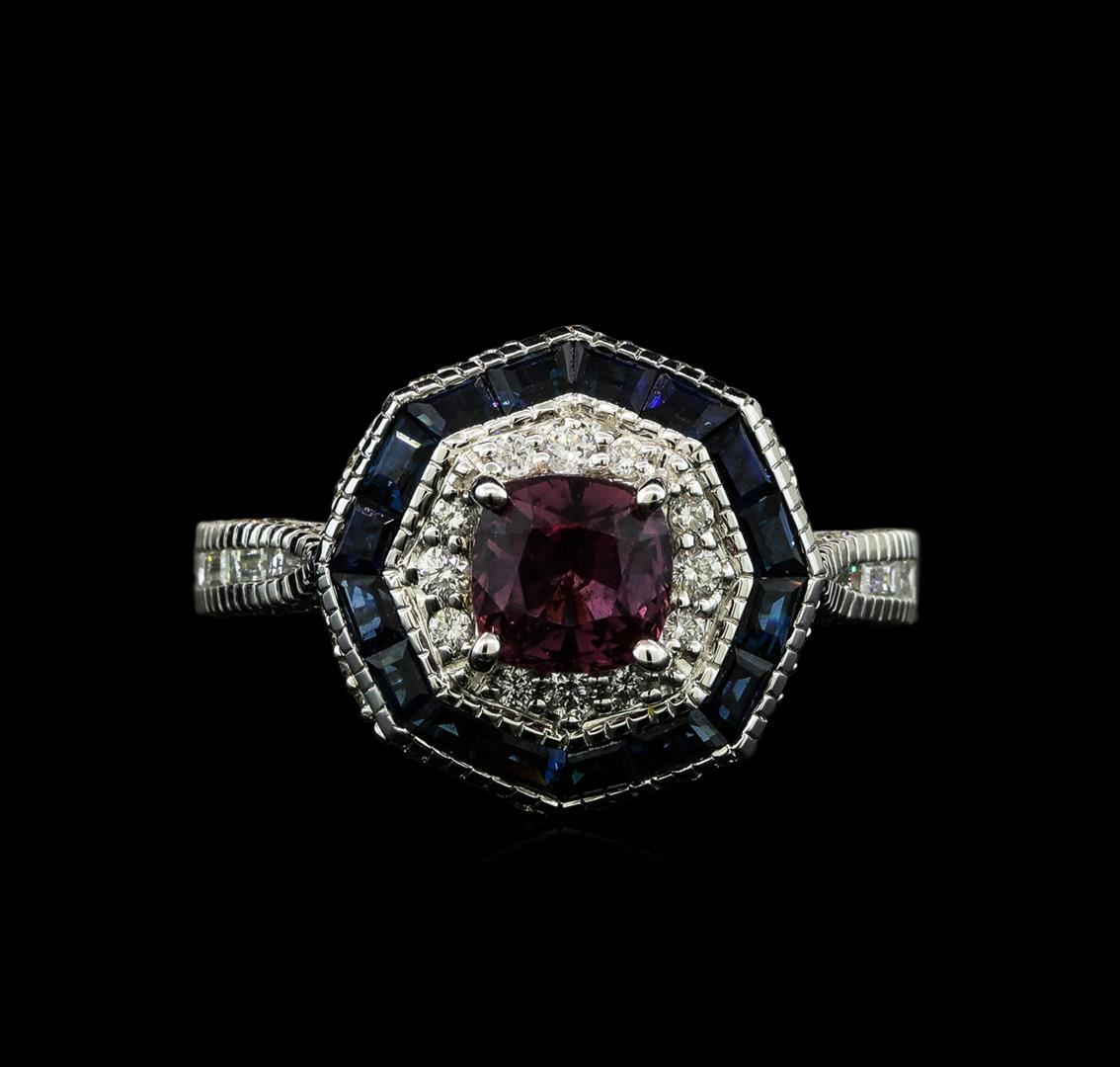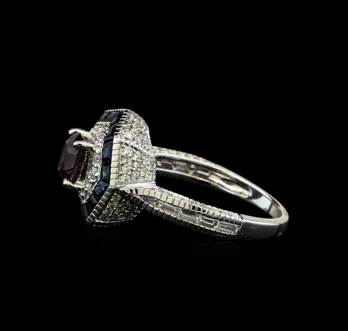 One electronically tested 18KT white gold lady's combination cast & assembled fashion ring with a octagonal double halo with a bright polish with milgrain detailing finish. The featured lady's ring has a shank measuring 1.85 millimeters wide. Identified with markings of "18K". Condition is new, good workmanship. Containing: One prong set square cushion modified mixed cut natural purple sapphire, measuring 5.95 x 5.90 x 3.94mm, (depth est.) approximate weight of 1.05ct., clarity is slightly included, medium dark, very slightly grayish, reddish purple color, (GIA rP 6/3), cut is very good. Transmitting light with a minimum of distortion, transparent. Colored gemstones are presumed to have been subjected to commonly used enhancement processes. Graded in the setting.Sixteen channel set baguette standard step cut natural blue sapphires, measuring 2.60 x 2.00 x 1.50mm, (depth est.) approximate total weight of 1.33ct., clarity is eye clean, medium dark, moderately strong, blue color, (GIA B 6/4), cut is very good. Transmitting light with no distortion, transparent. Colored gemstones are presumed to have been subjected to commonly used enhancement processes. Graded in the setting.Four prong set round brilliant cut diamonds, measuring 1.60 - 1.50 x 0.96mm (depth est.) approximate total weight of 4 Stones = 0.06ct. Graded in the setting. Clarity: VS-2 to SI-1. Color: G - HCut Very Good One Hundred Twenty prong set round brilliant cut diamonds, measuring 1.25 - 1.20 x 0.74mm (depth est.) approximate total weight of 120 Stones = 0.79ct. Graded in the setting. Clarity: VS-2 to SI-1. Color: G - HCut Good Ten channel set baguette cut diamonds, measuring from 2.10 x 1.00 x 0.85mm (depth est.) to 2.70 x 1.30 x 1.11mm (depth est.) approximate total weight of 10 Stones = 0.20ct. Graded in the setting. Clarity: VS-1 to VS-2. Color: G - HCut Very Good. Total Weight of Colored Stones 2.38ct. Total Weight of Diamonds 1.05ct. Total Weight of Ring 6.00gm. GAS Appraised.