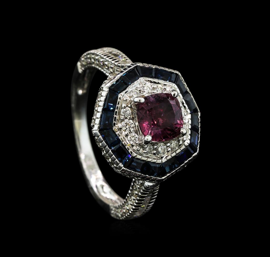 One electronically tested 18KT white gold lady's combination cast & assembled fashion ring with a octagonal double halo with a bright polish with milgrain detailing finish. The featured lady's ring has a shank measuring 1.85 millimeters wide. Identified with markings of "18K". Condition is new, good workmanship. Containing: One prong set square cushion modified mixed cut natural purple sapphire, measuring 5.95 x 5.90 x 3.94mm, (depth est.) approximate weight of 1.05ct., clarity is slightly included, medium dark, very slightly grayish, reddish purple color, (GIA rP 6/3), cut is very good. Transmitting light with a minimum of distortion, transparent. Colored gemstones are presumed to have been subjected to commonly used enhancement processes. Graded in the setting.Sixteen channel set baguette standard step cut natural blue sapphires, measuring 2.60 x 2.00 x 1.50mm, (depth est.) approximate total weight of 1.33ct., clarity is eye clean, medium dark, moderately strong, blue color, (GIA B 6/4), cut is very good. Transmitting light with no distortion, transparent. Colored gemstones are presumed to have been subjected to commonly used enhancement processes. Graded in the setting.Four prong set round brilliant cut diamonds, measuring 1.60 - 1.50 x 0.96mm (depth est.) approximate total weight of 4 Stones = 0.06ct. Graded in the setting. Clarity: VS-2 to SI-1. Color: G - HCut Very Good One Hundred Twenty prong set round brilliant cut diamonds, measuring 1.25 - 1.20 x 0.74mm (depth est.) approximate total weight of 120 Stones = 0.79ct. Graded in the setting. Clarity: VS-2 to SI-1. Color: G - HCut Good Ten channel set baguette cut diamonds, measuring from 2.10 x 1.00 x 0.85mm (depth est.) to 2.70 x 1.30 x 1.11mm (depth est.) approximate total weight of 10 Stones = 0.20ct. Graded in the setting. Clarity: VS-1 to VS-2. Color: G - HCut Very Good. Total Weight of Colored Stones 2.38ct. Total Weight of Diamonds 1.05ct. Total Weight of Ring 6.00gm. GAS Appraised.