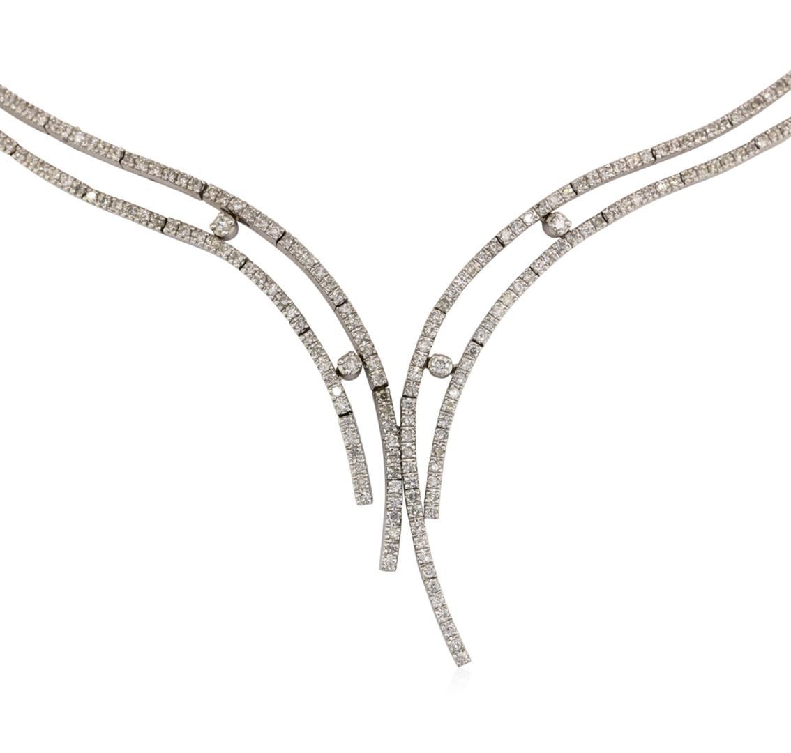 One electronically tested 18KT white gold lady's combination cast & assembled fashion necklace with a tongue clasp & foldover safety with a double row chevron motif with a bright polish finish. The featured lady's necklace measures approximately sixteen inches in length. Identified with markings of '750'. Condition is new, good workmanship. Containing: Four prong set round brilliant cut diamonds, measuring 2.40 - 2.30 x 1.46mm (depth est.) approximate total weight of 4 Stones = 0.20ct. Graded in the setting. Color H - I Clarity SI-2 to I-1 Cut Good Two Hundred Thirty-Five prong set round brilliant cut diamonds, measuring 1.40 - 1.30 x 0.84mm (depth est.) approximate total weight of 235 Stones = 2.20ct. Color H - I Clarity SI-2 to I-1 Cut Good. Total Weight of Diamonds 2.40ct. Total Weight of Necklace 40.70gm. GAS Appraised.