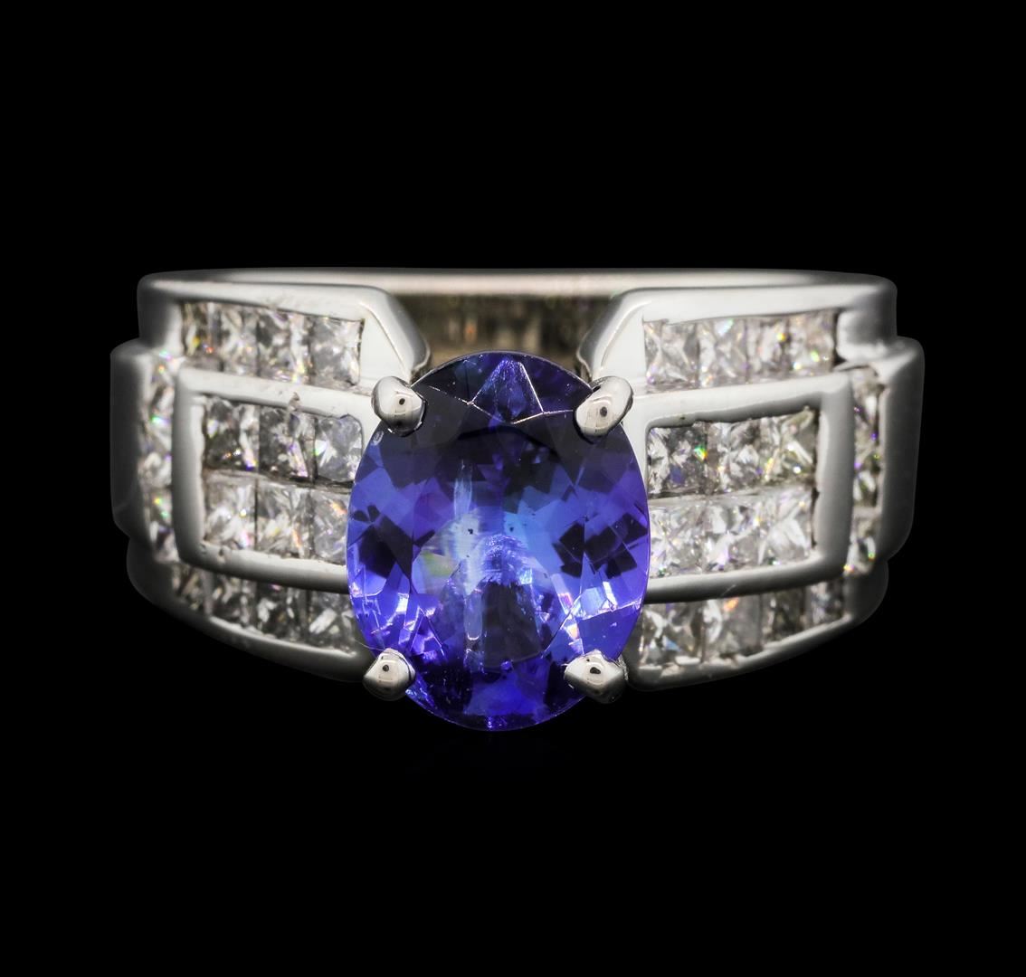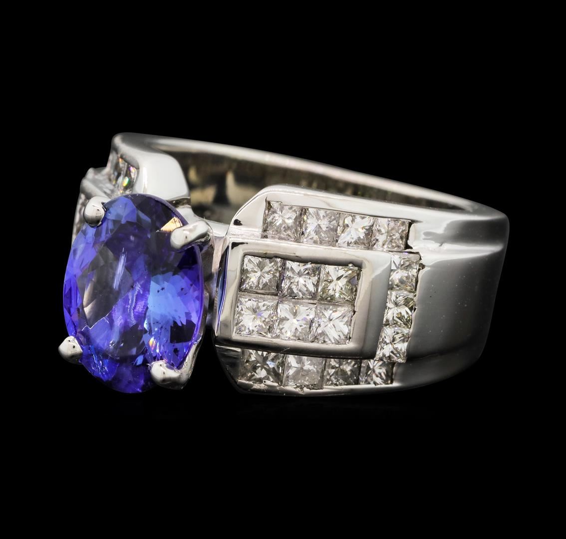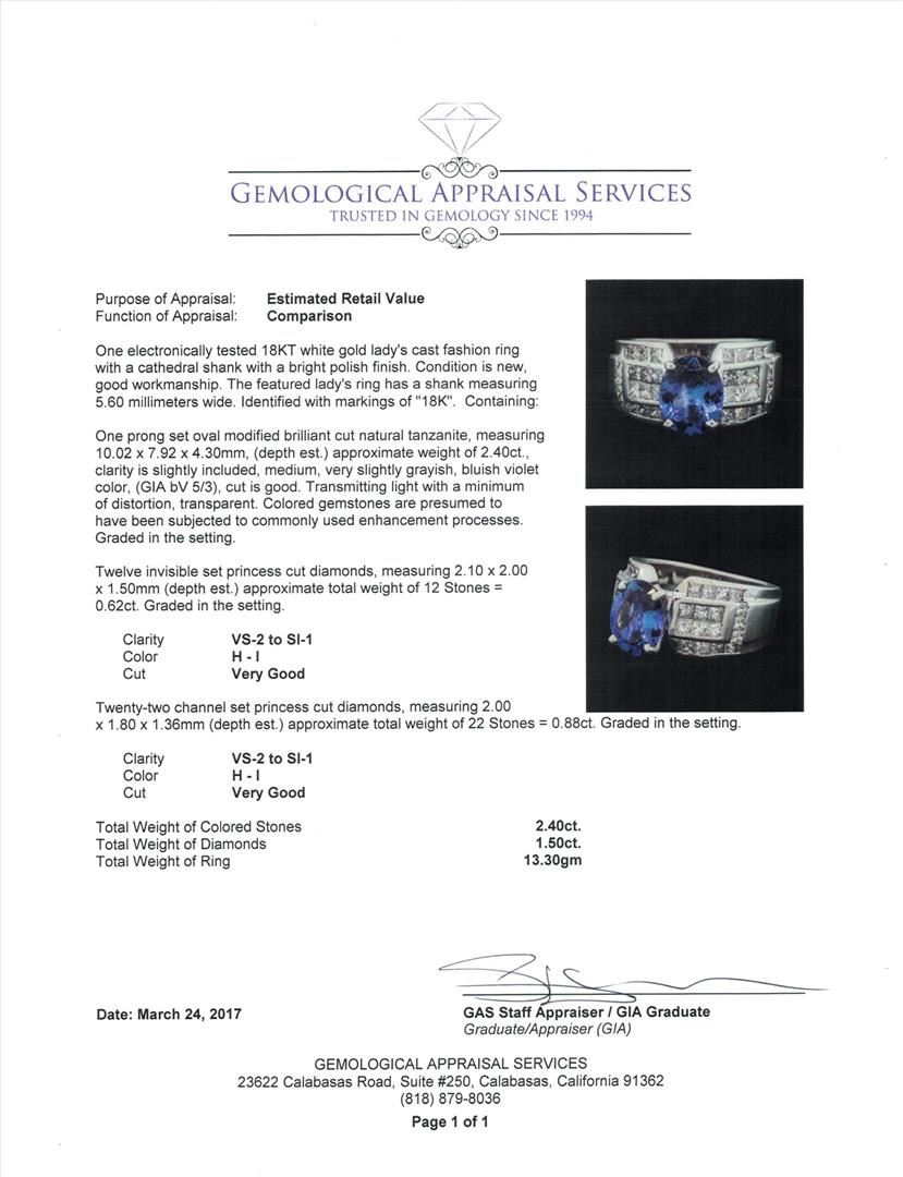 One electronically tested 18KT white gold lady's cast fashion ring with a cathedral shank with a bright polish finish. The featured lady's ring has a shank measuring 5.60 millimeters wide. Identified with markings of "18K". Condition is new, good workmanship. Containing: One prong set oval modified brilliant cut natural tanzanite, measuring 10.02 x 7.92 x 4.30mm, (depth est.) approximate weight of 2.40ct., clarity is slightly included, medium, very slightly grayish, bluish violet color, (GIA bV 5/3), cut is good. Transmitting light with a minimum of distortion, transparent. Colored gemstones are presumed to have been subjected to commonly used enhancement processes. Graded in the setting. Twelve invisible set princess cut diamonds, measuring 2.10 x 2.00 x 1.50mm (depth est.) approximate. Total Weight of 12 Stones = 0.62ct. Graded in the setting. Color H - I Clarity VS-2 to SI-1 Cut Very Good Twenty-Two channel set princess cut diamonds, measuring 2.00 x 1.80 x 1.36mm (depth est.) approximate. Total Weight of 22 Stones = 0.88ct. Graded in the setting. Color H - I Clarity VS-2 to SI-1 Cut Very Good. Total Weight of Colored Stones 2.40ct.. Total Weight of Diamonds 1.50ct.. Total Weight of Ring 13.30gm. GAS Appraised.