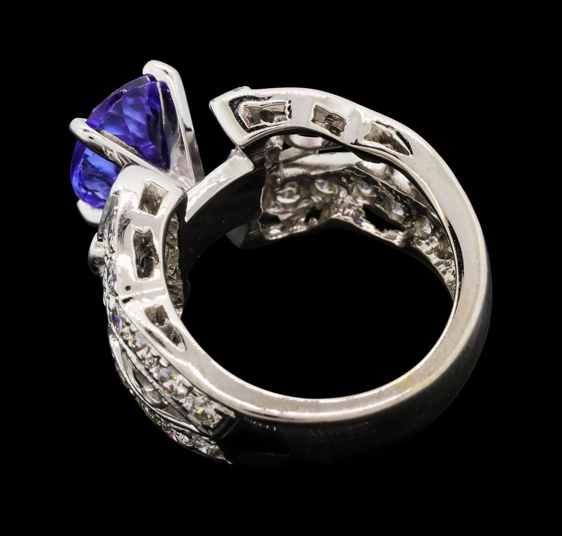 One electronically tested 18KT white gold lady's combination cast & assembled fashion ring with a scalloped split shank with a bright polish with milgrain detailing finish. The featured lady's ring has a shank measuring 4.80 millimeters wide. Identified with markings of "18K". Condition is new, good workmanship. Containing: One prong set oval modified brilliant cut natural tanzanite, measuring 9.89 x 7.90 x 4.50mm, (depth est.) approximate weight of 2.45ct., clarity is eye clean, medium light, very slightly grayish, bluish violet color, (GIA bV 4/3), cut is good. Transmitting light with no distortion, transparent. Colored gemstones are presumed to have been subjected to commonly used enhancement processes. Graded in the setting. Four bezel set baguette cut diamonds, measuring from 3.25 x 1.90 x 1.62mm (depth est.) to 3.30 x 2.00 x 1.70mm (depth est.) approximate. Total Weight of 4 Stones = 0.40ct. Graded in the setting. Color H - I Clarity VS-1 to SI-1 Cut Very Good Twenty-Six bead set round brilliant cut diamonds, measuring 2.35 - 2.30 x 1.45mm (depth est.) approximate. Total Weight of 26 Stones = 1.25ct. Graded in the setting. Color H - JClarity VS-2 to SI-1 Cut Good. Total Weight of Colored Stones 2.45ct.. Total Weight of Diamonds 1.65ct.. Total Weight of Ring 9.30gm. GAS Appraised.