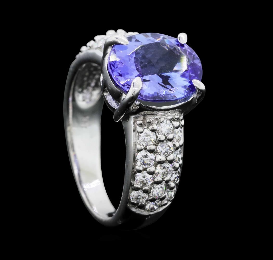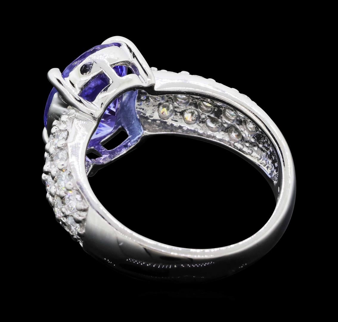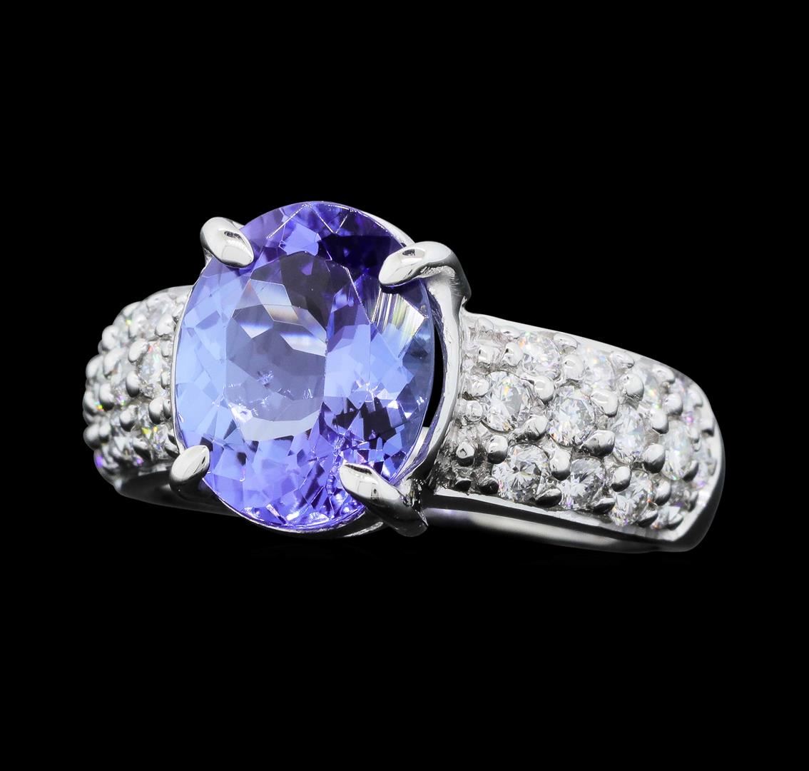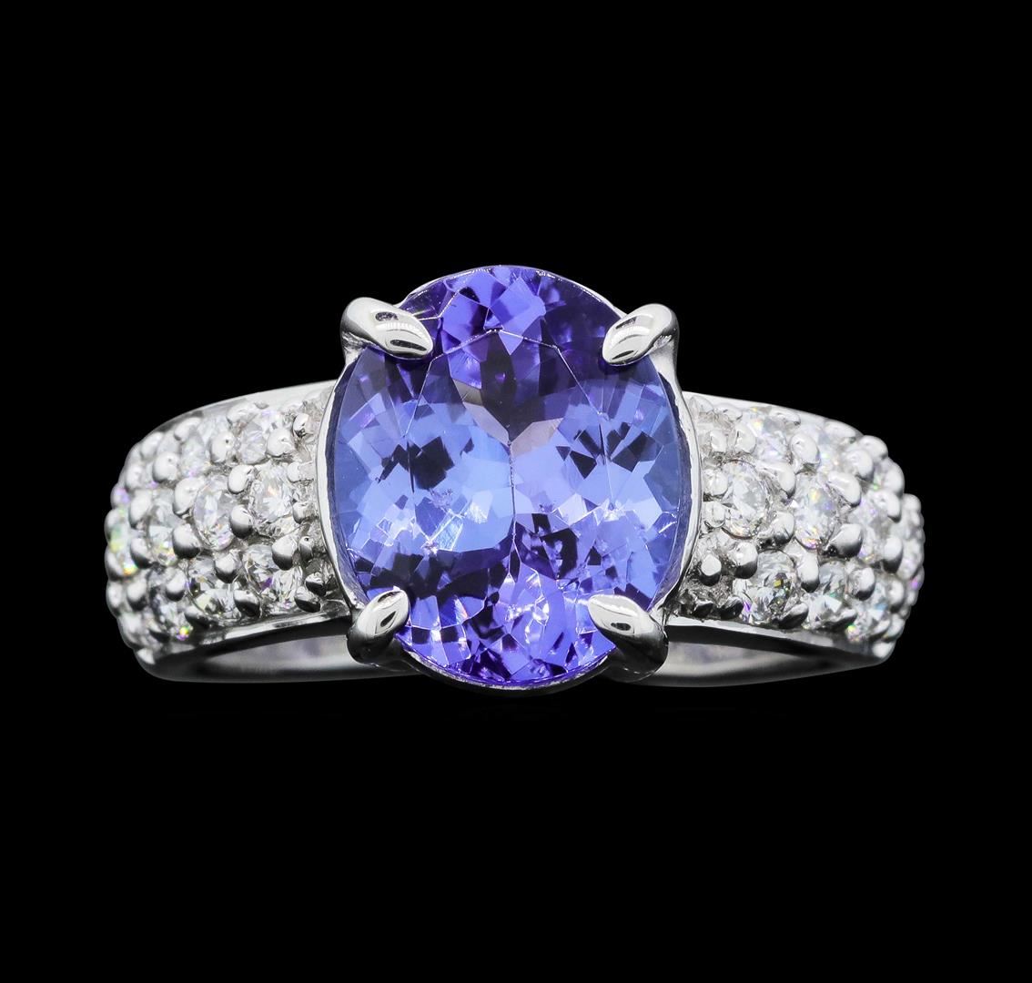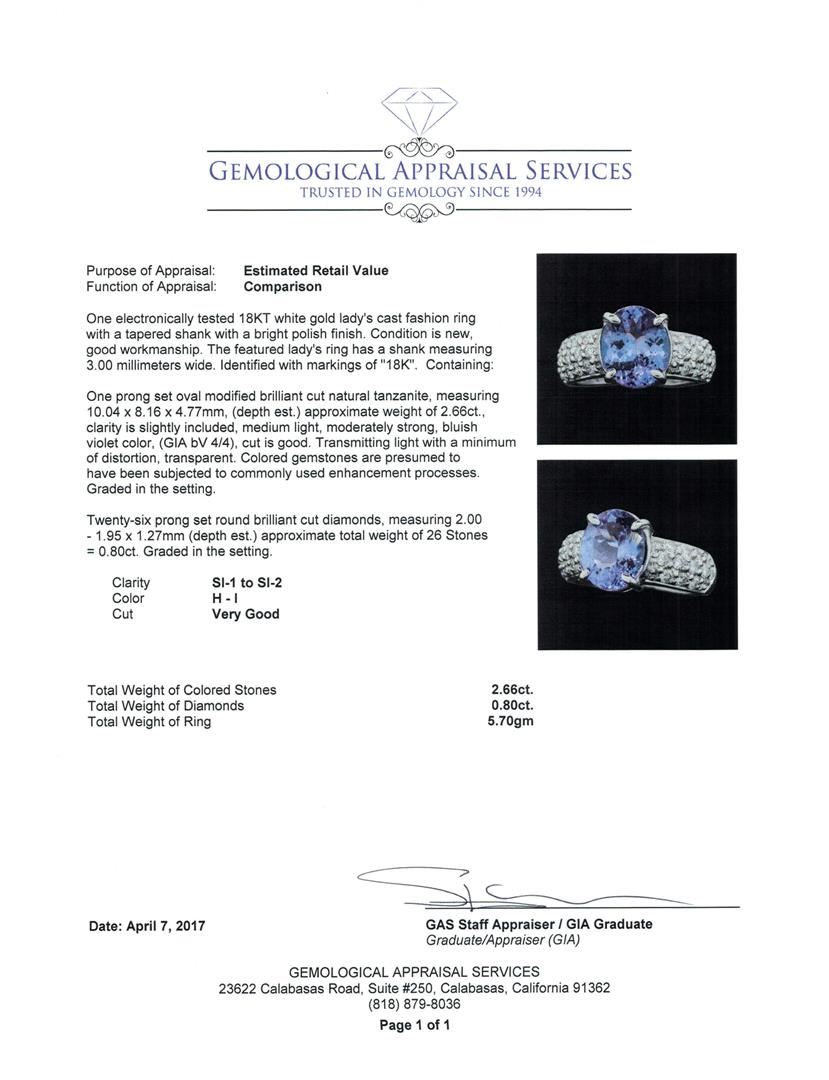 One electronically tested 18KT white gold lady's cast fashion ring with a tapered shank with a bright polish finish. The featured lady's ring has a shank measuring 3.00 millimeters wide. Identified with markings of "18K". Condition is new, good workmanship. Containing: One prong set oval modified brilliant cut natural tanzanite, measuring 10.04 x 8.16 x 4.77mm, (depth est.) approximate weight of 2.66ct., clarity is slightly included, medium light, moderately strong, bluish violet color, (GIA bV 4/4), cut is good. Transmitting light with a minimum of distortion, transparent. Colored gemstones are presumed to have been subjected to commonly used enhancement processes. Graded in the setting. Twenty-Six prong set round brilliant cut diamonds, measuring 2.00 - 1.95 x 1.27mm (depth est.) approximate total weight of 26 Stones = 0.80ct. Graded in the setting. Color H - I Clarity SI-1 to SI-2 Cut Very Good. Total Weight of Colored Stones 2.66ct. Total Weight of Diamonds 0.80ct. Total Weight of Ring 5.70gm. GAS Appraised.