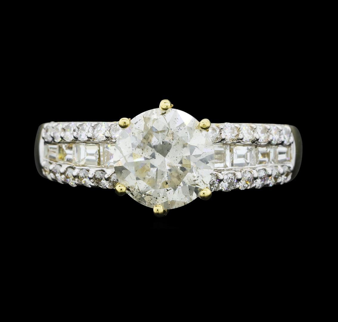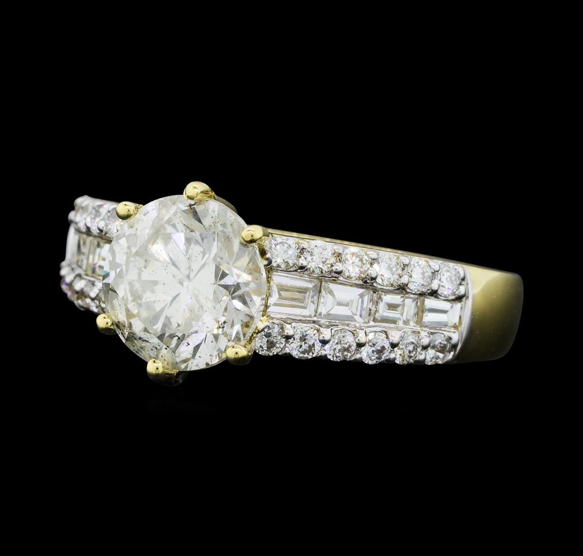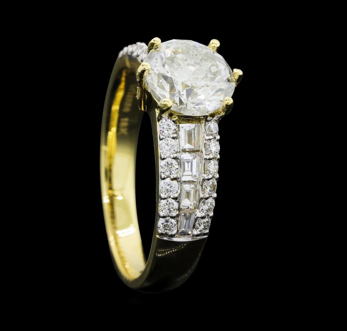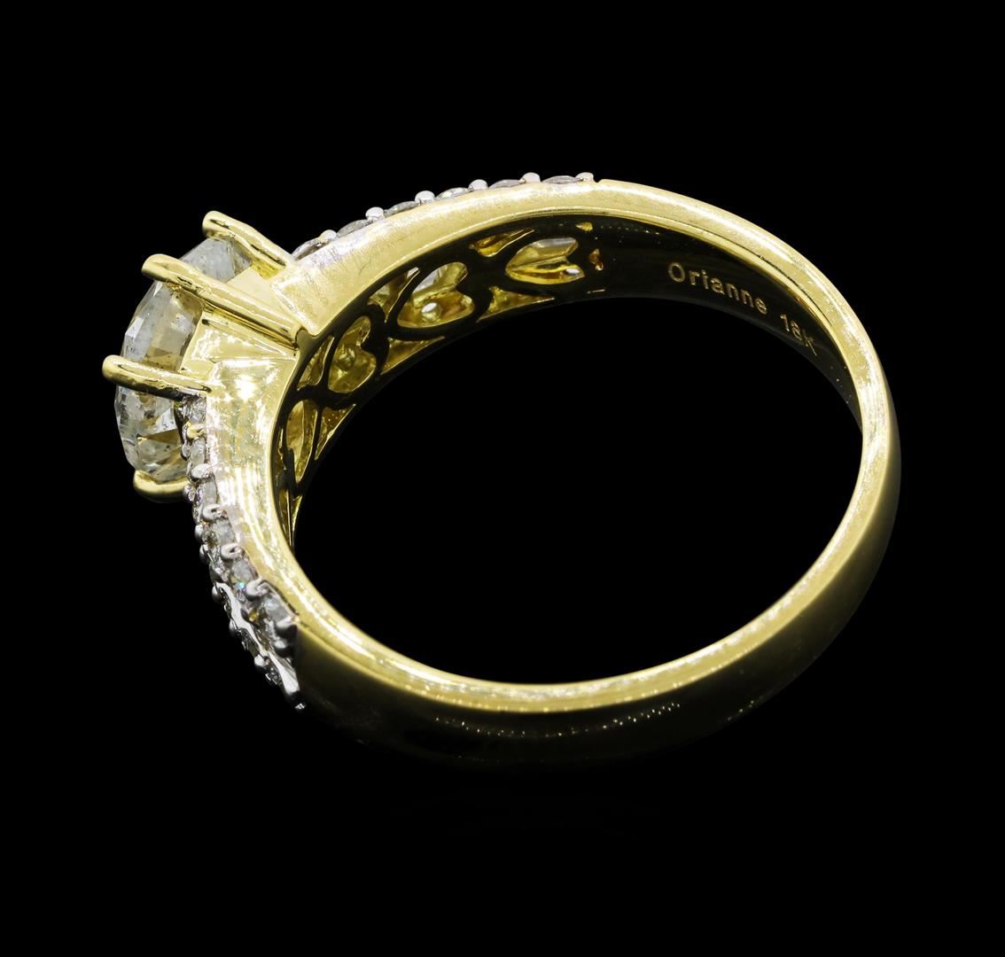 One electronically tested 18KT yellow gold ladies cast diamond unity ring. The featured diamond is supported by elaborate diamond set shoulders, completed by a two and one-half millimeter wide band. Bright polish finish with rhodium accents. Trademark is Orianne. Identified with markings of "18K". Condition is new, good workmanship. Containing: One prong set round brilliant cut diamond, measuring 7.75 - 7.70 x 5.09mm exact weight 2.01ct with a strong fluorescence. EGL Platinum Report attached. Graded loose prior to setting in the EGL Laboratory Report #1658012730. Clarity: SI-3. Color: FDepth 65.9%. Table 61.0%. Pavil. Depth%. 46.0%. Thirty-Two prong & channel set round brilliant & baguette cut diamonds approximate total weight of 32 Stones = 0.70ct. Graded in the setting. Clarity: VS-1 to VS-2. Color: F - H. Total Weight of Diamonds 2.71ct. Total Weight of Ring 5.47gm. AIG Appraised.
