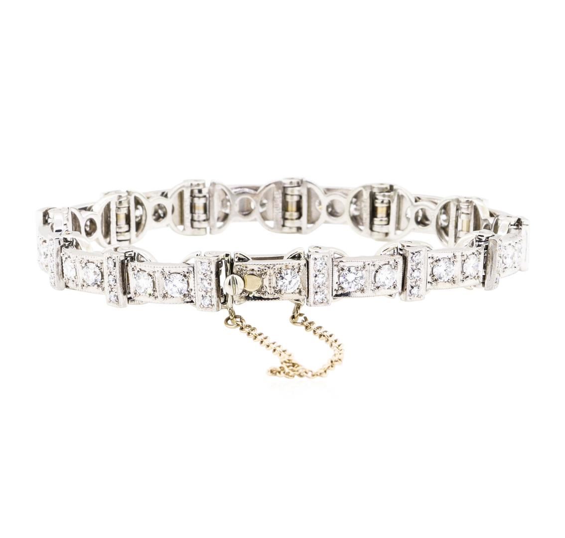 One electronically tested 18KT white gold lady's combination cast & assembled fashion bracelet with a tongue clasp with safety chain with a bright polish finish. The featured lady's bracelet measures approximately six and a half inches in length. Identified with markings of '18K'. Condition is new, good workmanship. Containing: Twenty-Five prong set round brilliant cut diamonds, measuring 3.00 - 2.90 x 1.83mm (depth est.) approximate total weight of 25 Stones = 2.45ct. Graded in the setting. Color H - I Clarity VS-1 to VS-2 Cut Very Good Thirty-Nine prong set single cut diamonds, measuring 1.40 - 1.30 x 0.81mm (depth est.) approximate total weight of 39 Stones = 0.30ct. Graded in the setting. Color G - H Clarity VS-1 to VS-2 Cut Good. Total Weight of Diamonds 2.75ct.. Total Weight of Bracelet 28.40gm. GAS Appraised.