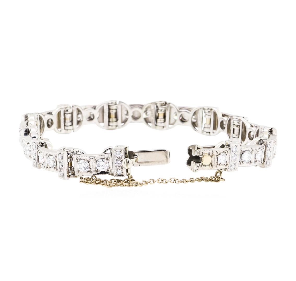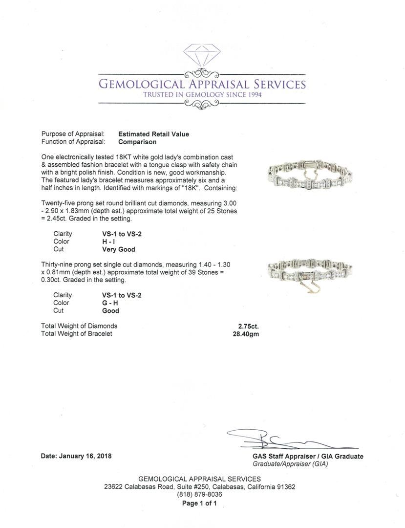One electronically tested 18KT white gold ladies combination cast & assembled fashion bracelet with a tongue clasp with safety chain with a bright polish finish. The featured ladies bracelet measures approximately six and a half inches in length. Identified with markings of "18K'. Condition is new, good workmanship. Containing: Twenty-Five prong set round brilliant cut diamonds, measuring 3.00 - 2.90 x 1.83mm (depth est.) approximate total weight of 25 Stones = 2.45ct. Graded in the setting. Color H - I Clarity VS-1 to VS-2 Cut Very Good Thirty-Nine prong set single cut diamonds, measuring 1.40 - 1.30 x 0.81mm (depth est.) approximate total weight of 39 Stones = 0.30ct. Graded in the setting. Color G - H Clarity VS-1 to VS-2 Cut Good. Total Weight of Diamonds 2.75ct. Total Weight of Bracelet 28.40gm. GAS Appraised.