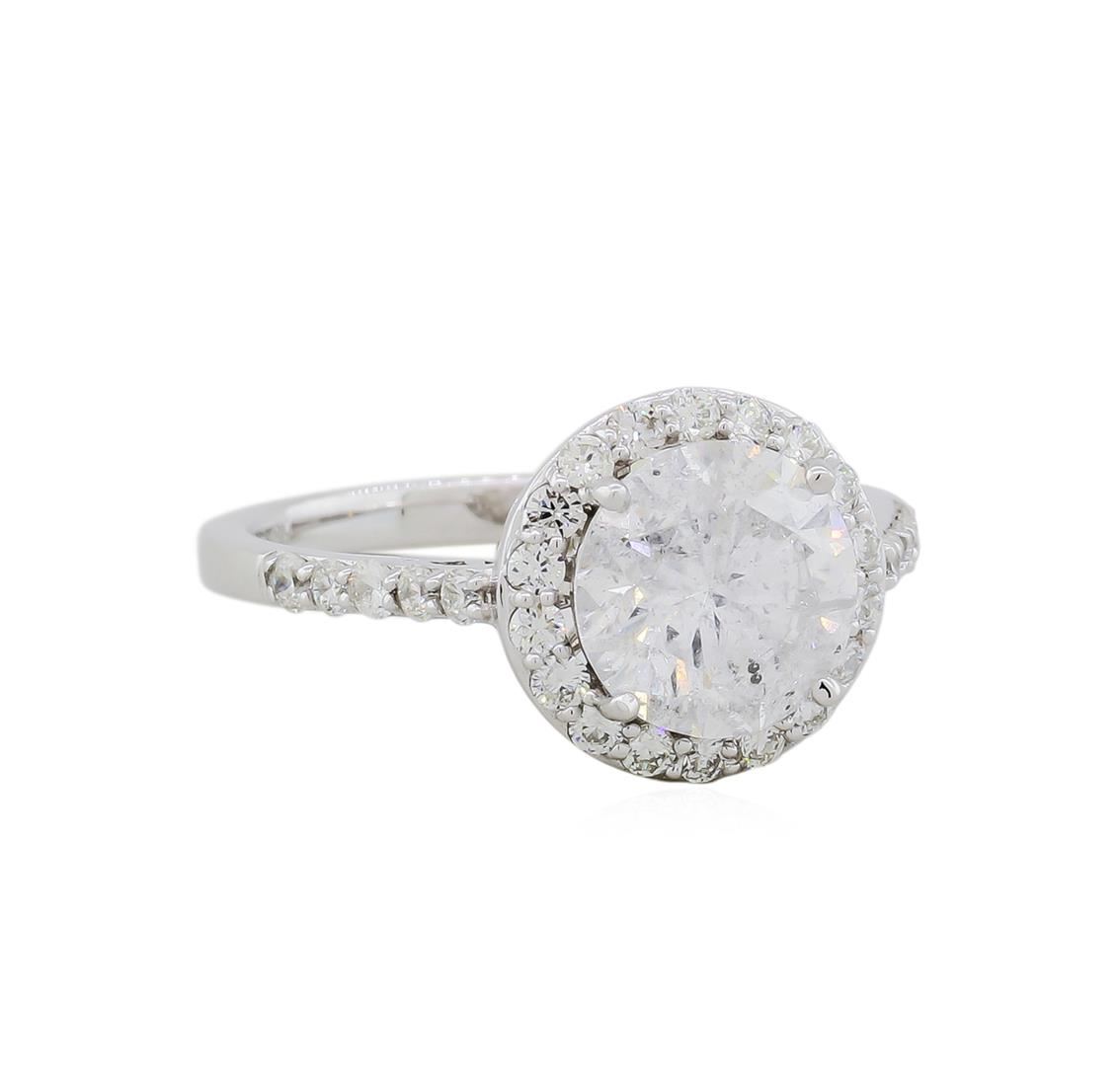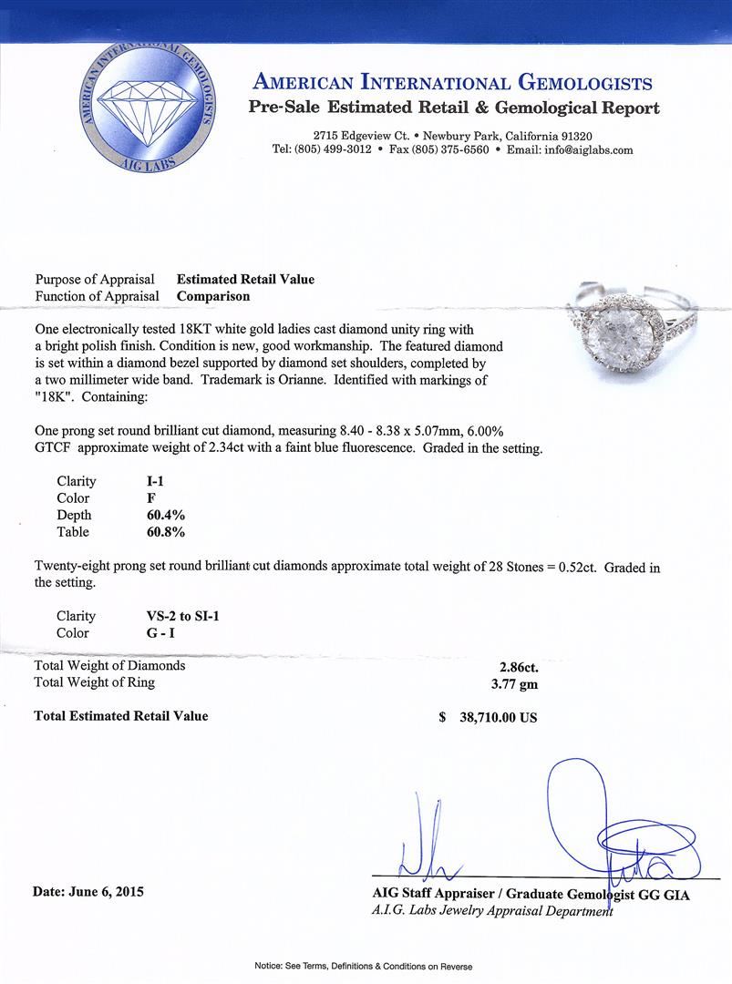 One electronically tested 18KT white gold ladies cast diamond unity ring with a bright polish finish. The featured diamond is set within a diamond bezel supported by diamond set shoulders, completed by a two millimeter wide band. Trademark is Orianne. Identified with markings of "18K". Condition is new, good workmanship. Containing: One prong set round brilliant cut diamond, measuring 8.40 - 8.38 x 5.07mm, 6.00.%. GTCF approximate weight of 2.34ct with a faint blue fluorescence. Graded in the setting. Clarity: I-1. Color: F. Depth 60.4%. Table 60.8%. Twenty-Eight prong set round brilliant cut diamonds approximate. Total Weight of 28 Stones = 0.52ct. Graded in the setting. Clarity: VS-2 to SI-1. Color: G - I. Total Weight of Diamonds 2.86ct. AIG Appraised at $38,710.00.